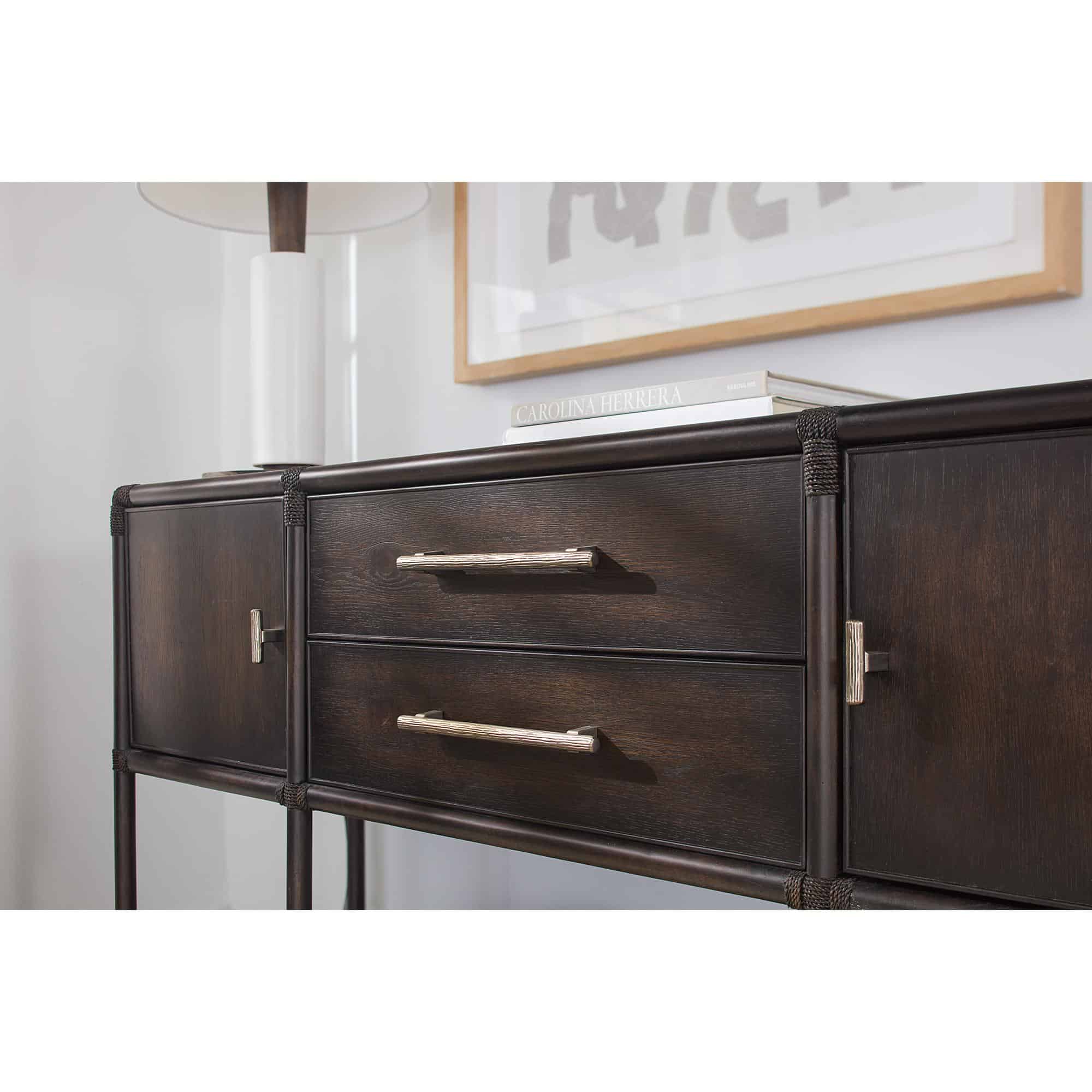 Finish: Black Sand: Transparent by design to showcase the unique grain patterns of the veneer, Black Sand was inspired by the black silk sands found on the shorelines of exotic beaches of Maui and Tahiti. Soft pewter bar pulls and “T” pulls.