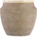 - Finish: Travertine marble veneer top features brown, beige, gray and cream colors. Brown rope wrapping.