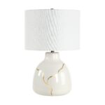 The Rhodes table lamp brings artful elegance to any space with its ivory ceramic base, embellished with graceful gold leafing inspired by Kintsugi craftsmanship. A clean off-white drum shade and dark antique brushed brass accents balance the design with modern flair. Warm and sophisticated, its gentle glow shines through its imperfect beauty.
