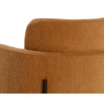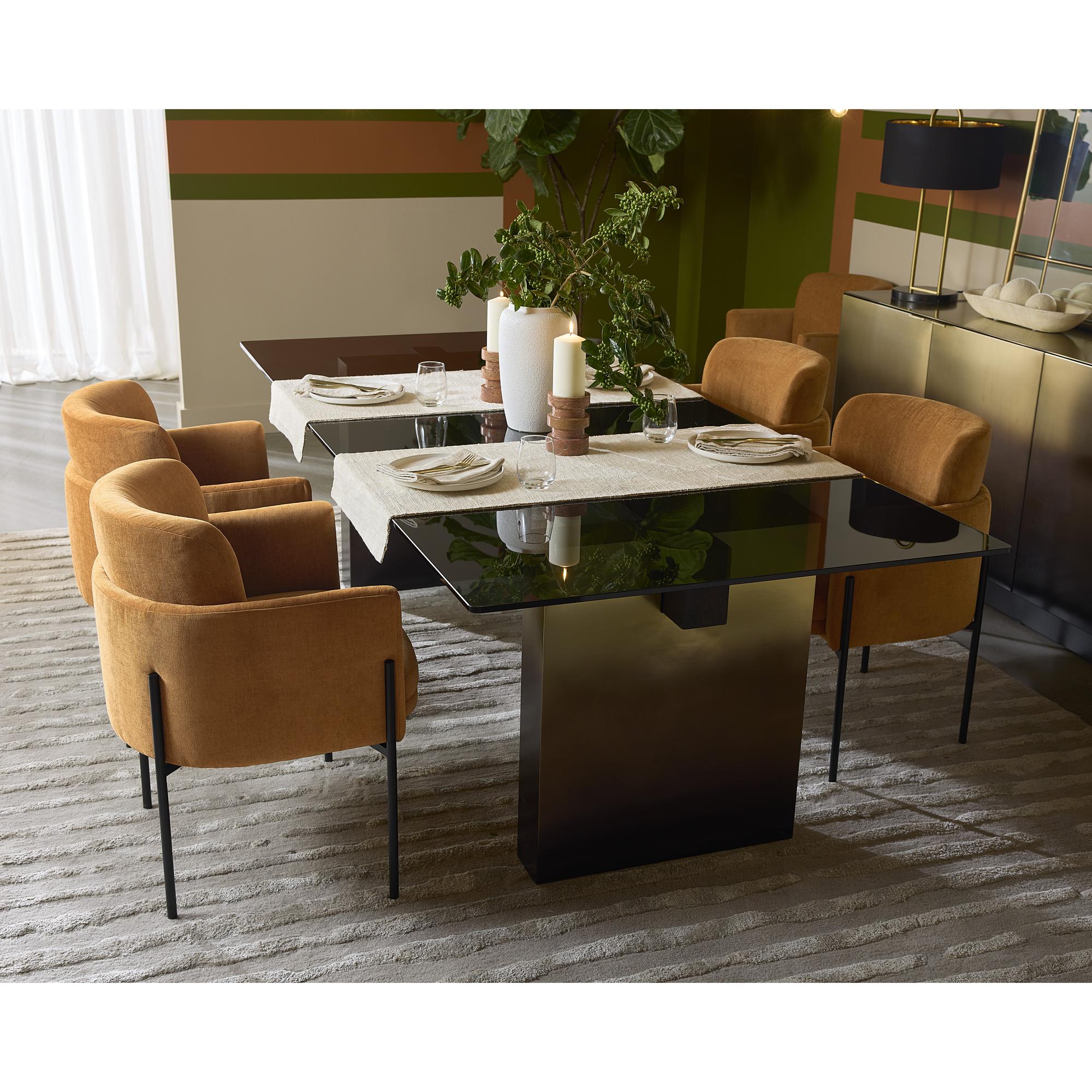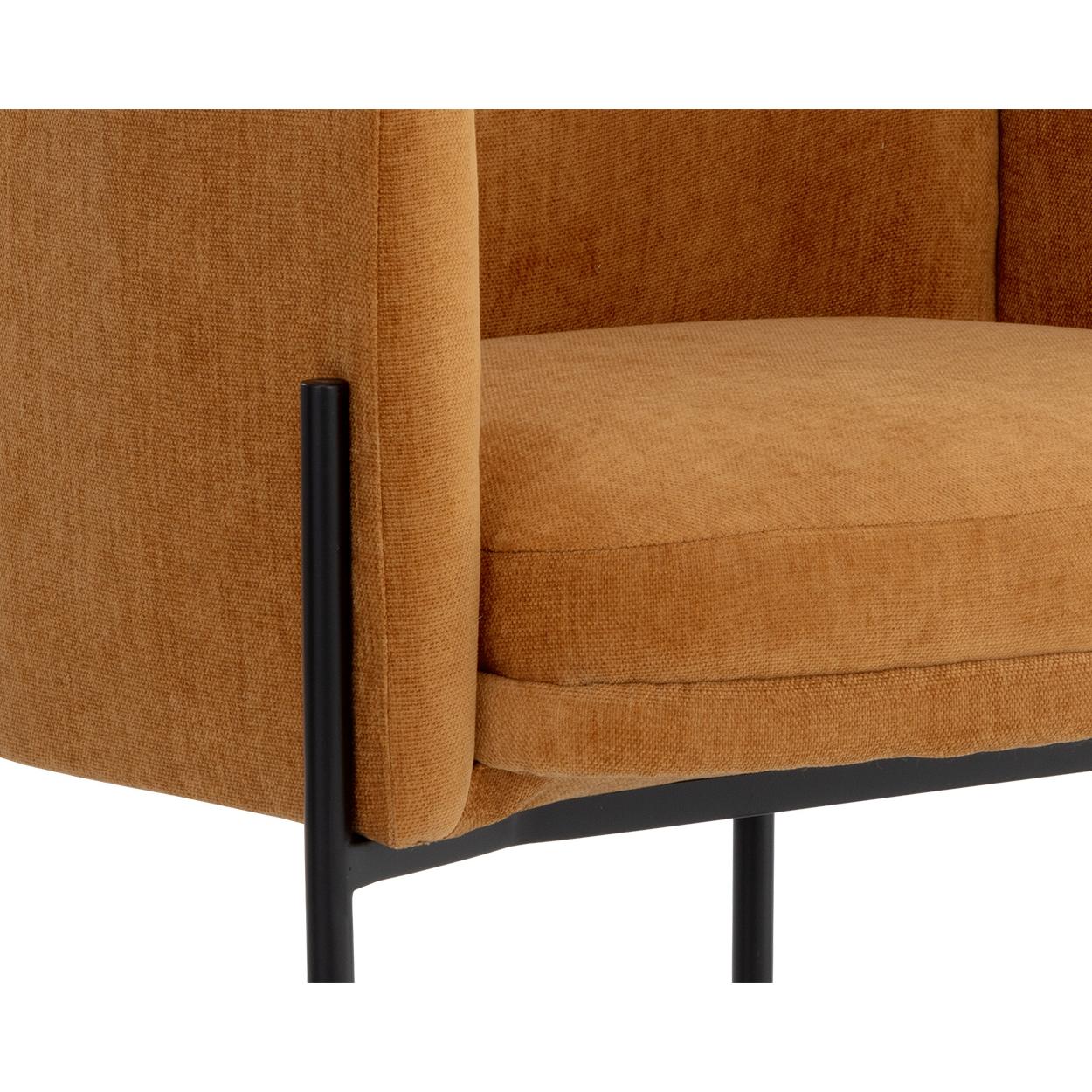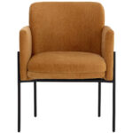 Invite guests to dine in style with this modern dining armchair. Designed with a comfortable seat in a softly textured danny amber fabric with exposed black metal legs.