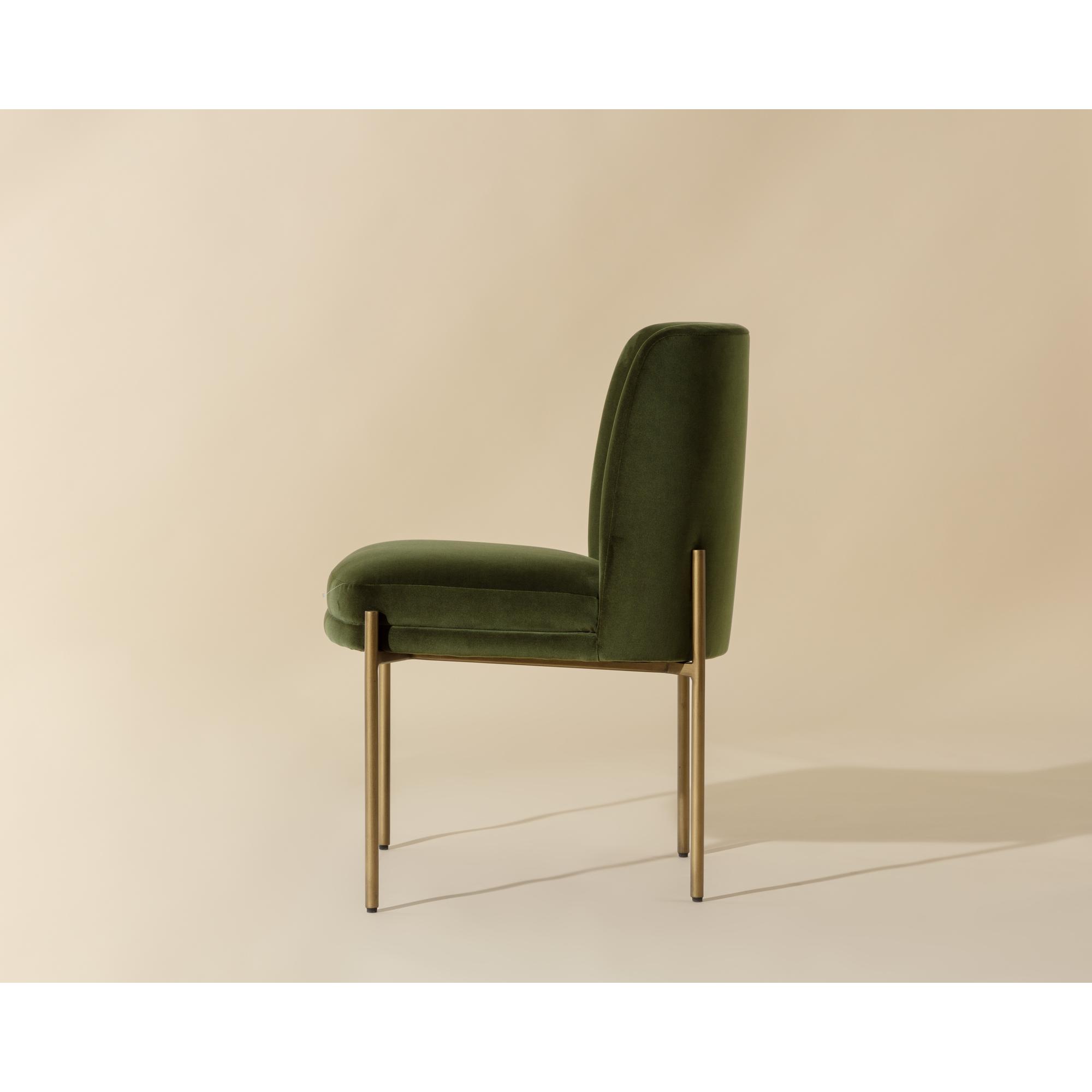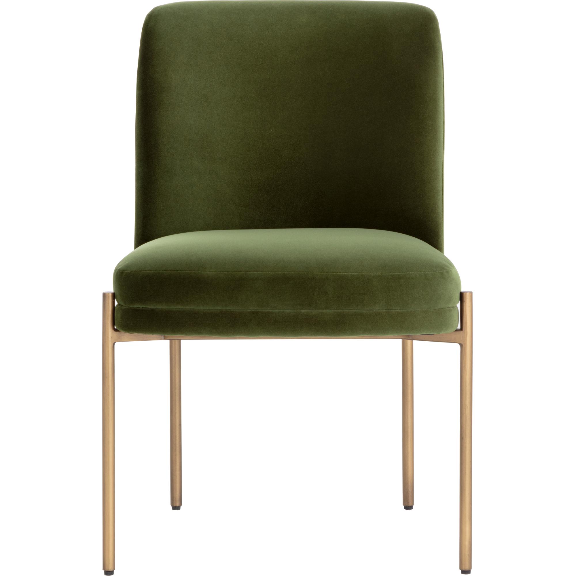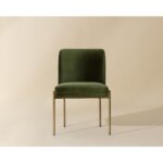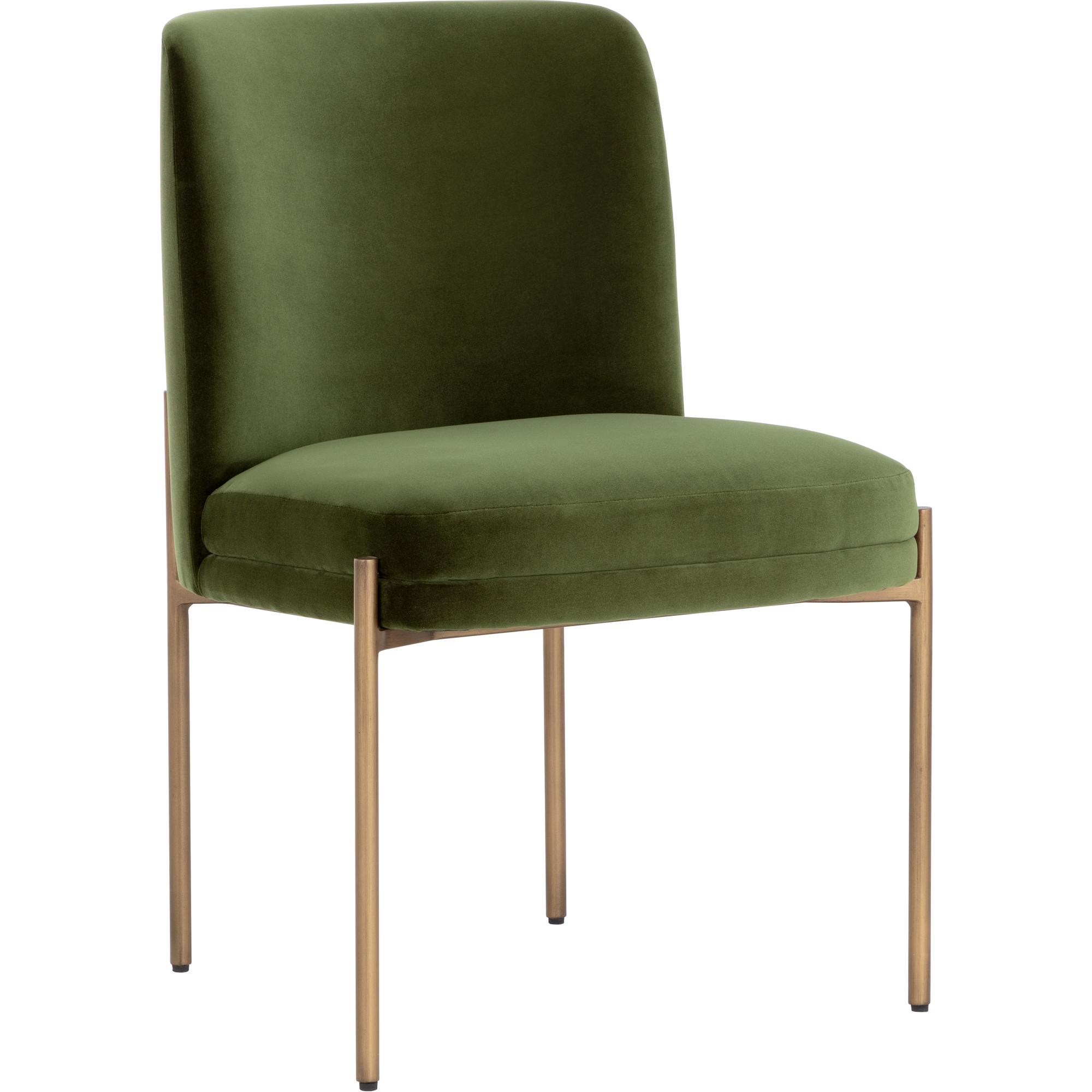 Invite guests to dine in style with the Richie Dining Chair. Designed with a comfortable seat in a softly textured forest green fabric with exposed antique brass metal legs.