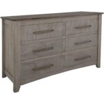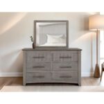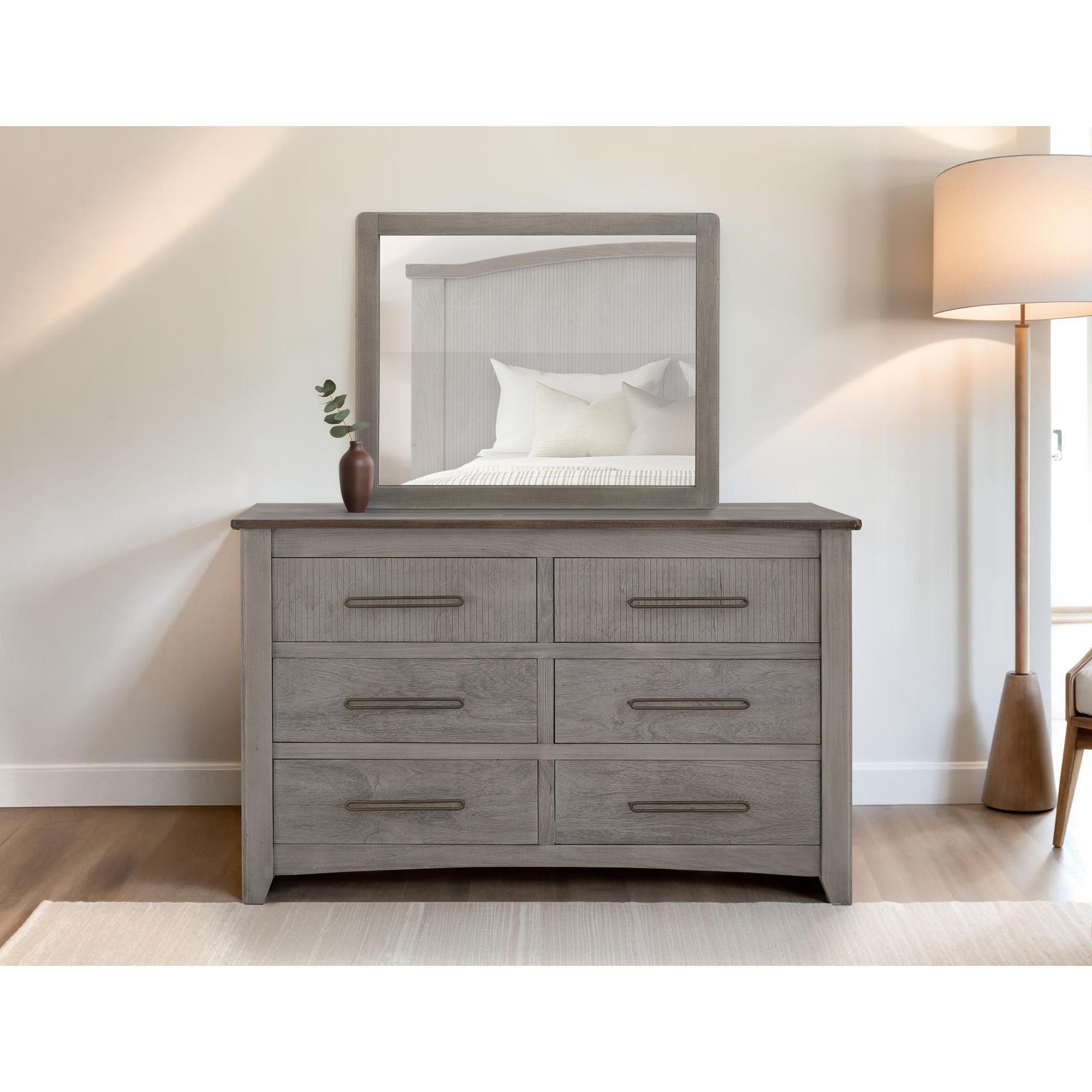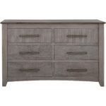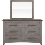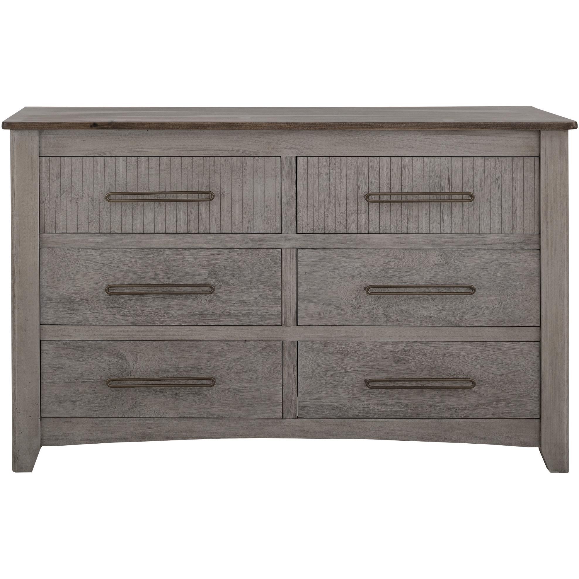 The Ridge dresser features six spacious drawers, offering plenty of storage for all your bedroom essentials. It features sleek metal handles that enhance its modern aesthetic. Made from Melina and poplar wood, this collection guarantees durability and timeless appeal. The elegant light gray finish and brown tops blend seamlessly with any decor style. Additionally, the channeled design adds a touch of sophistication and texture to the furniture.