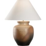 The Rika Table Lamp, part of the Shiga collection, is hand turned with sandy clay from the bed of Lake Biwa, which has a warm orange color and makes for a very durable pottery. It is finished in one of six ancient kilns in Japan and completed with cloth wiring and topped with a refined rolled-edge linen shade. Made in Japan.