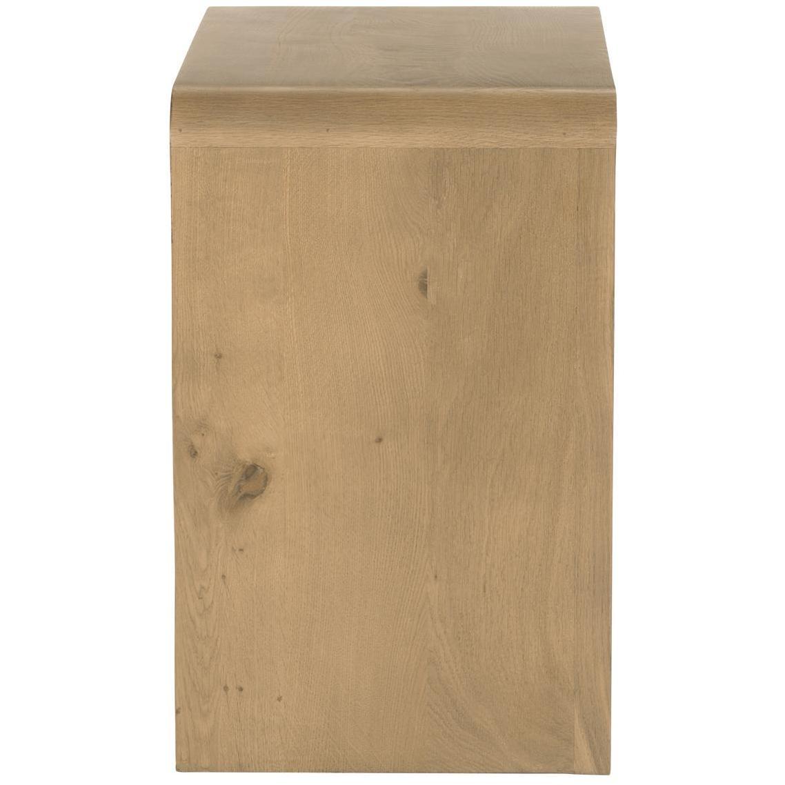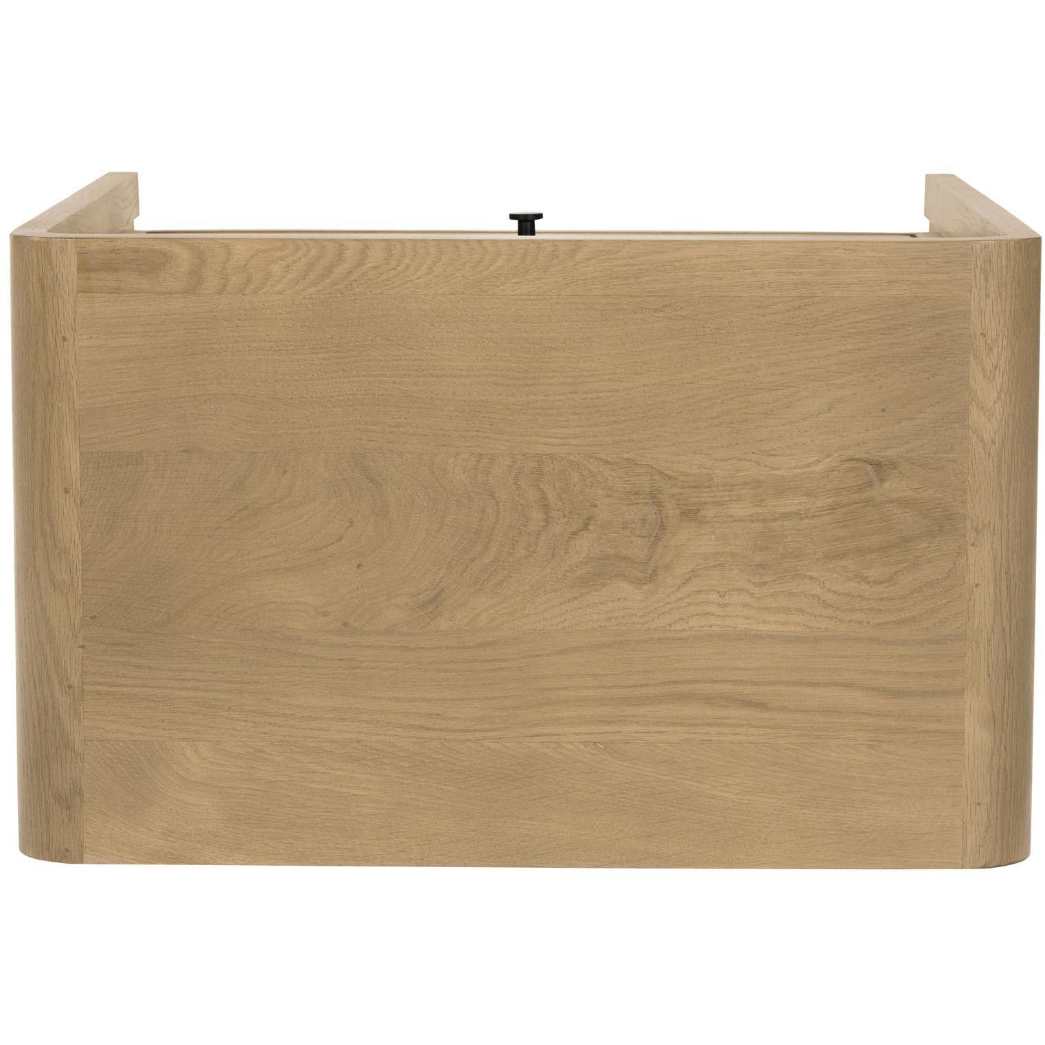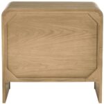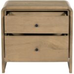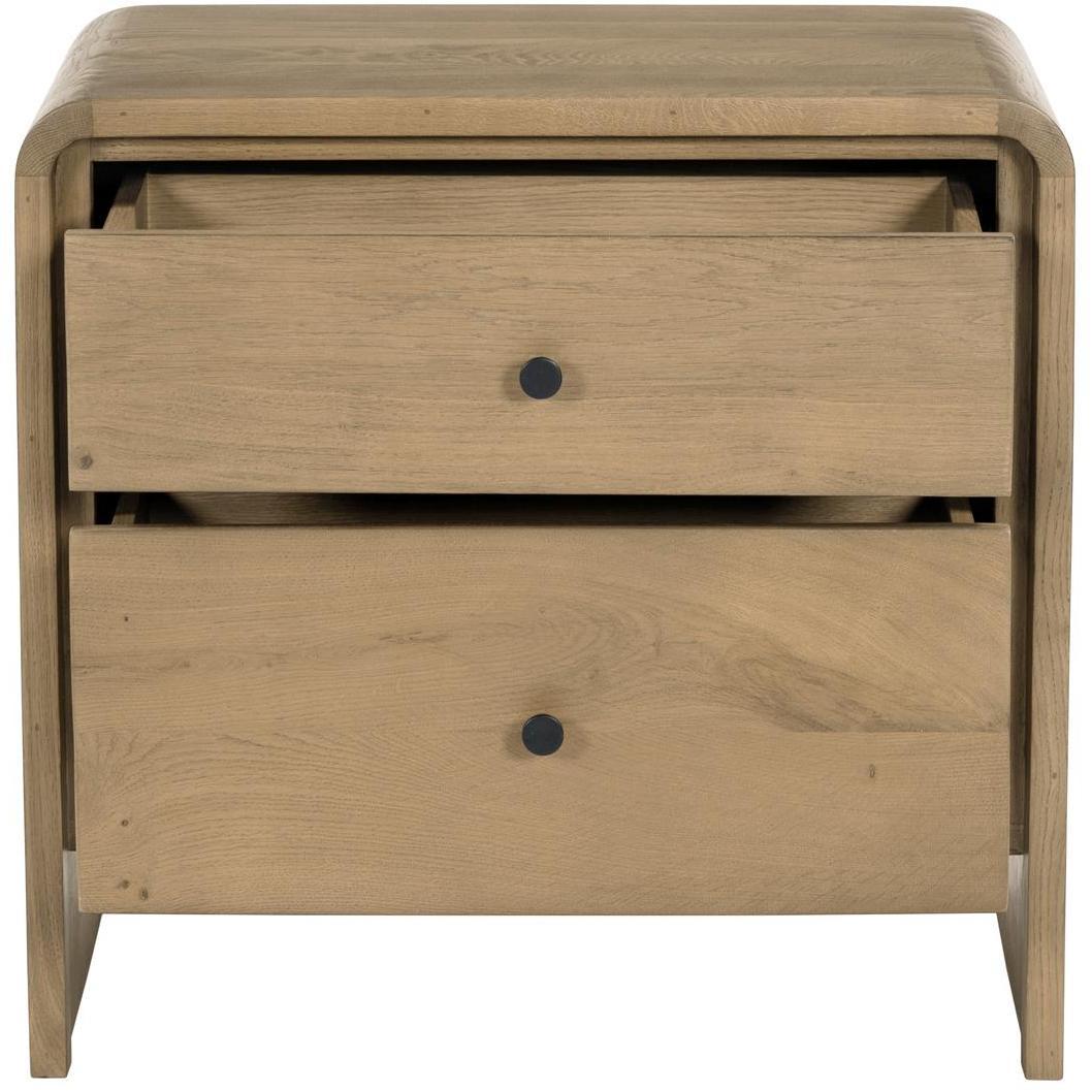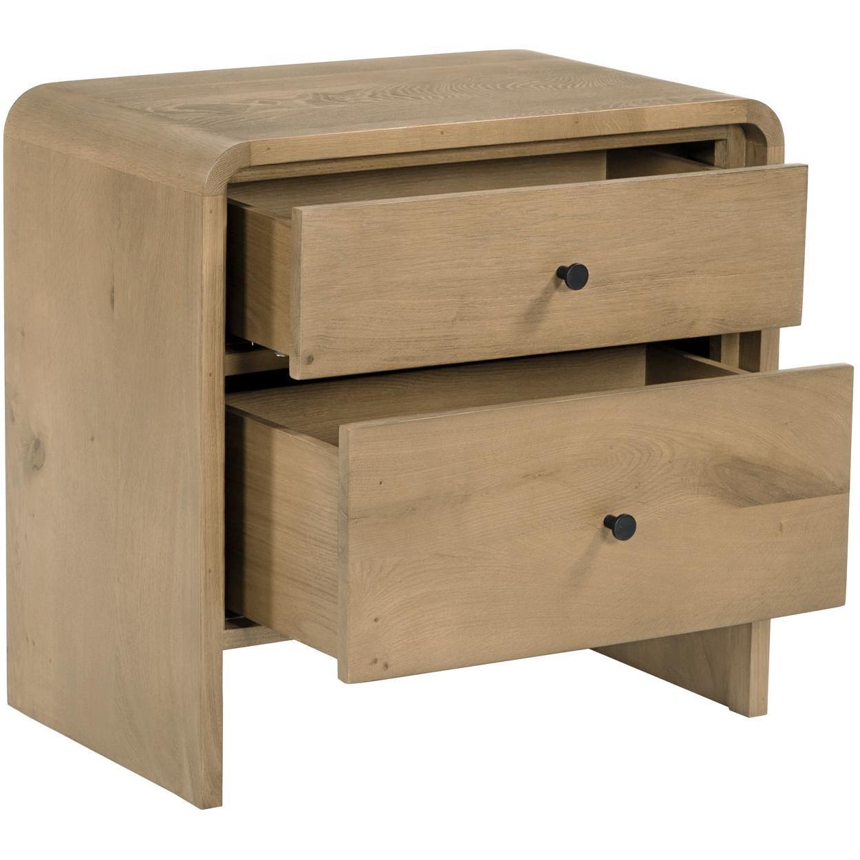 Featuring a unique waterfall edge and overhang detailing, the Riley nightstand offers captivating visual interest, underscored by its solid oak construction. The seamless design is a timeless blend of sophistication and practicality, with ample two-drawer storage.