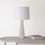 A European flair fills the contemporary interior through this table lamp design. With a sleek and luxurious onyx body and a bright, off-white shade, this table lamp feels like a work of art in the living room interior. Clients will appreciate this dichotomy of this piece’s cool quality during the day and warmth at night.