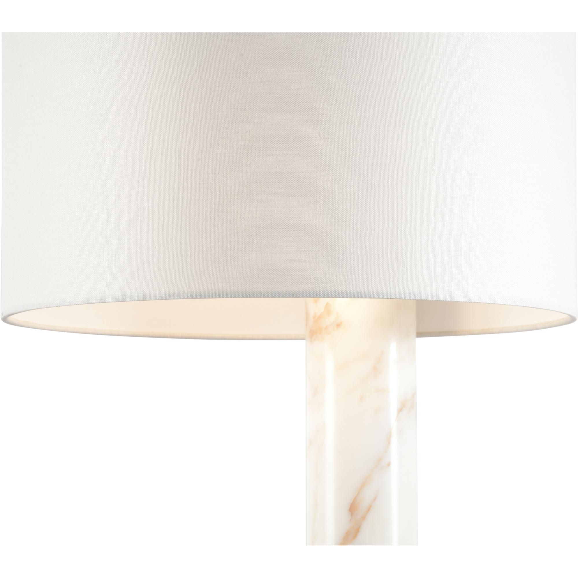 Rimini lamp features an offset column of striking calacatta gold marble with intricate veining details supported by a coffee bronze finished metal base. An off white linen drum shade completes this lovely table lamp perfect for use as a primary decorative piece in any modern home or office.