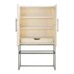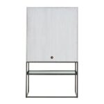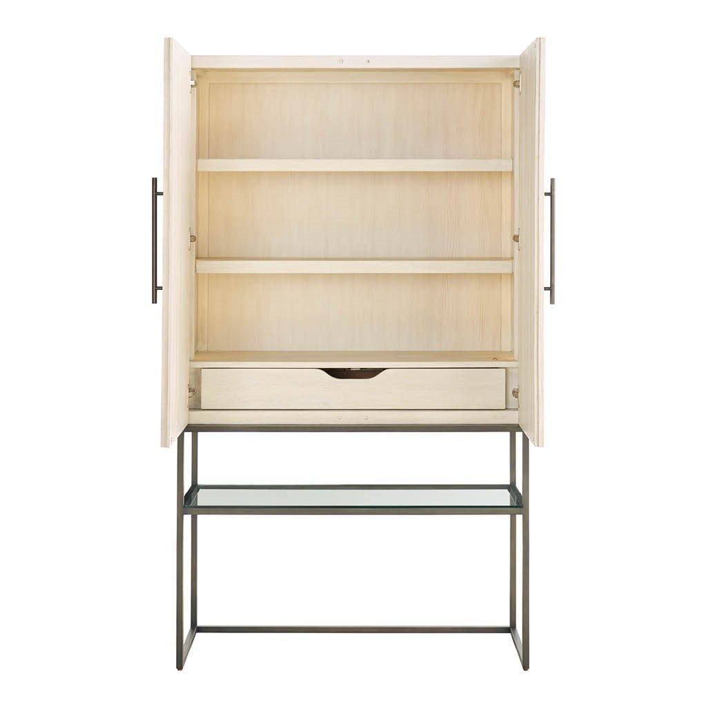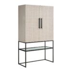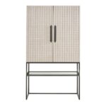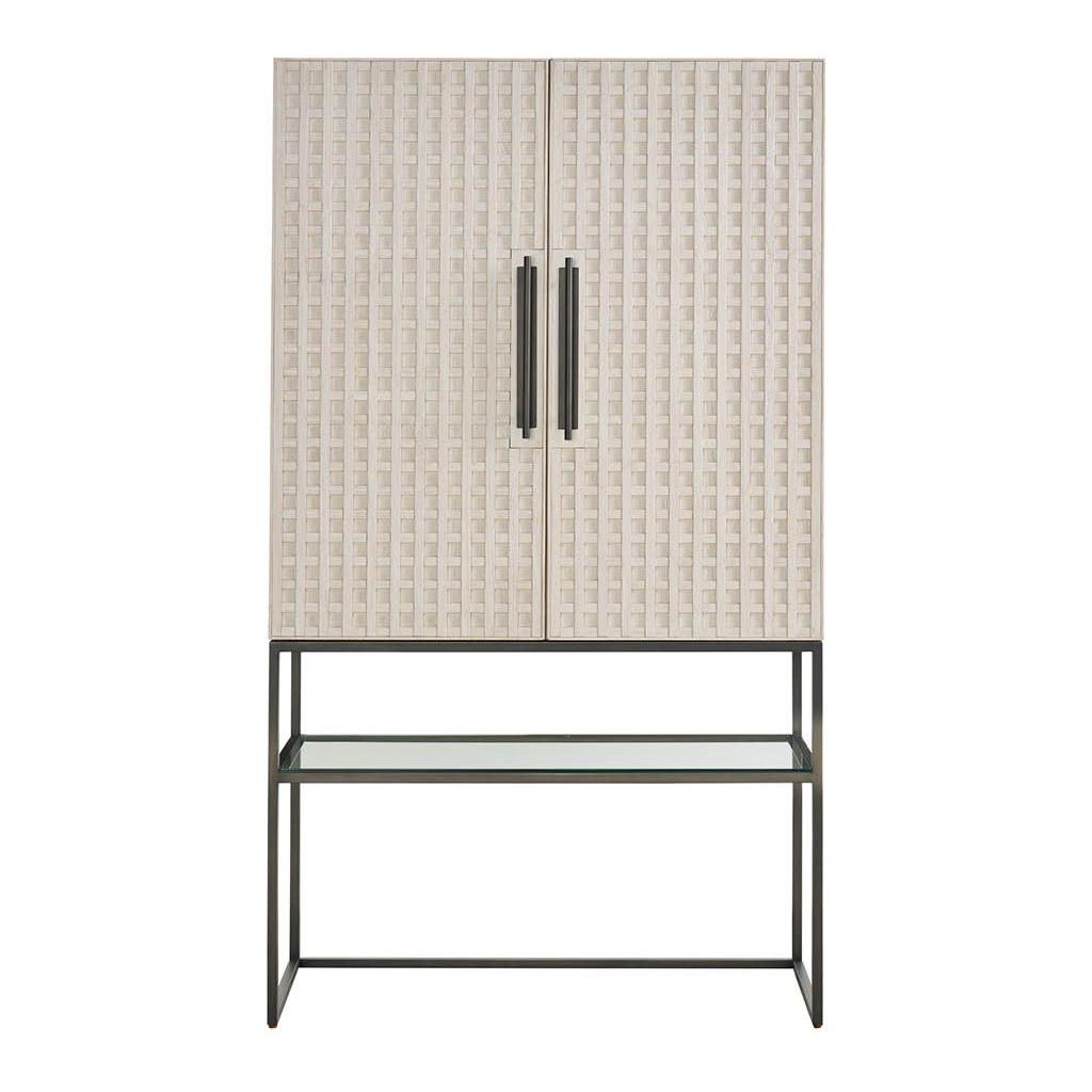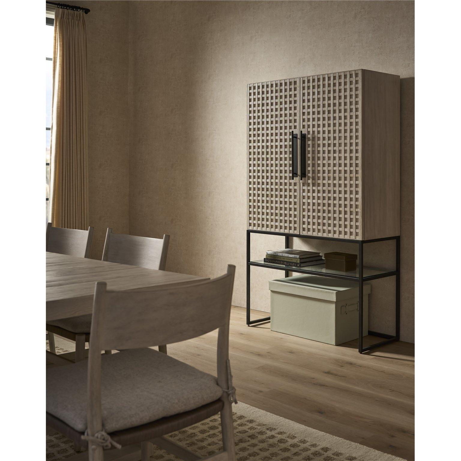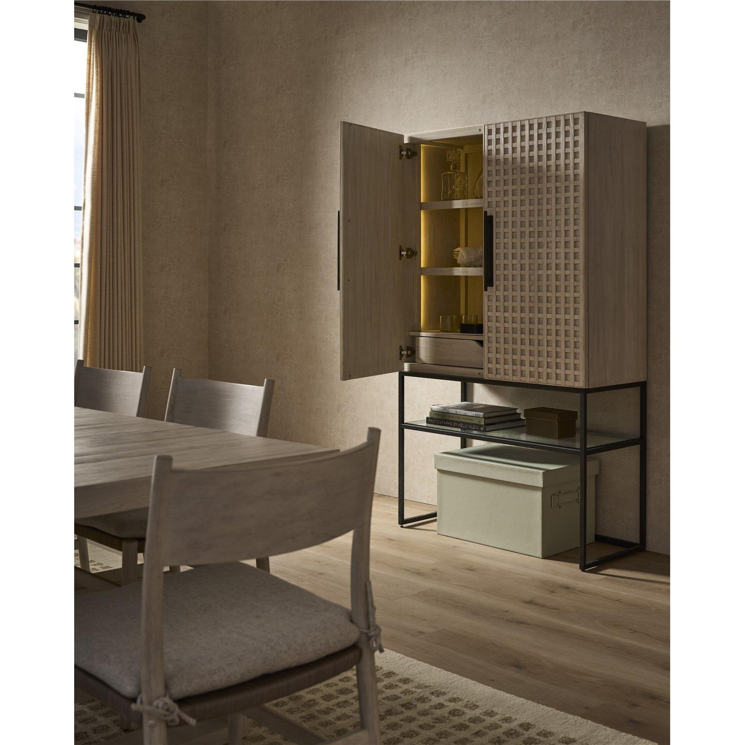 The River Rock Bar Cabinet combines architectural detail with modern functionality. Featuring the collection’s signature latticework design and a light and airy River Rock finish, its upper cabinet offers stylish storage, while the open metal base with a glass shelf provides a contemporary display area. This bar cabinet is a sophisticated addition to any entertaining space, blending form and function with a touch of refined elegance.