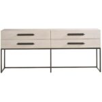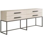 The River Rock Metal Base Console blends industrial chic with natural warmth. Featuring a sleek metal base and a light and airy River Rock finish, its clean lines and four spacious drawers offer both style and functionality. This console adds a modern, architectural touch to your entryway, living room, or dining area, perfect for those seeking a blend of contemporary design and practical storage.