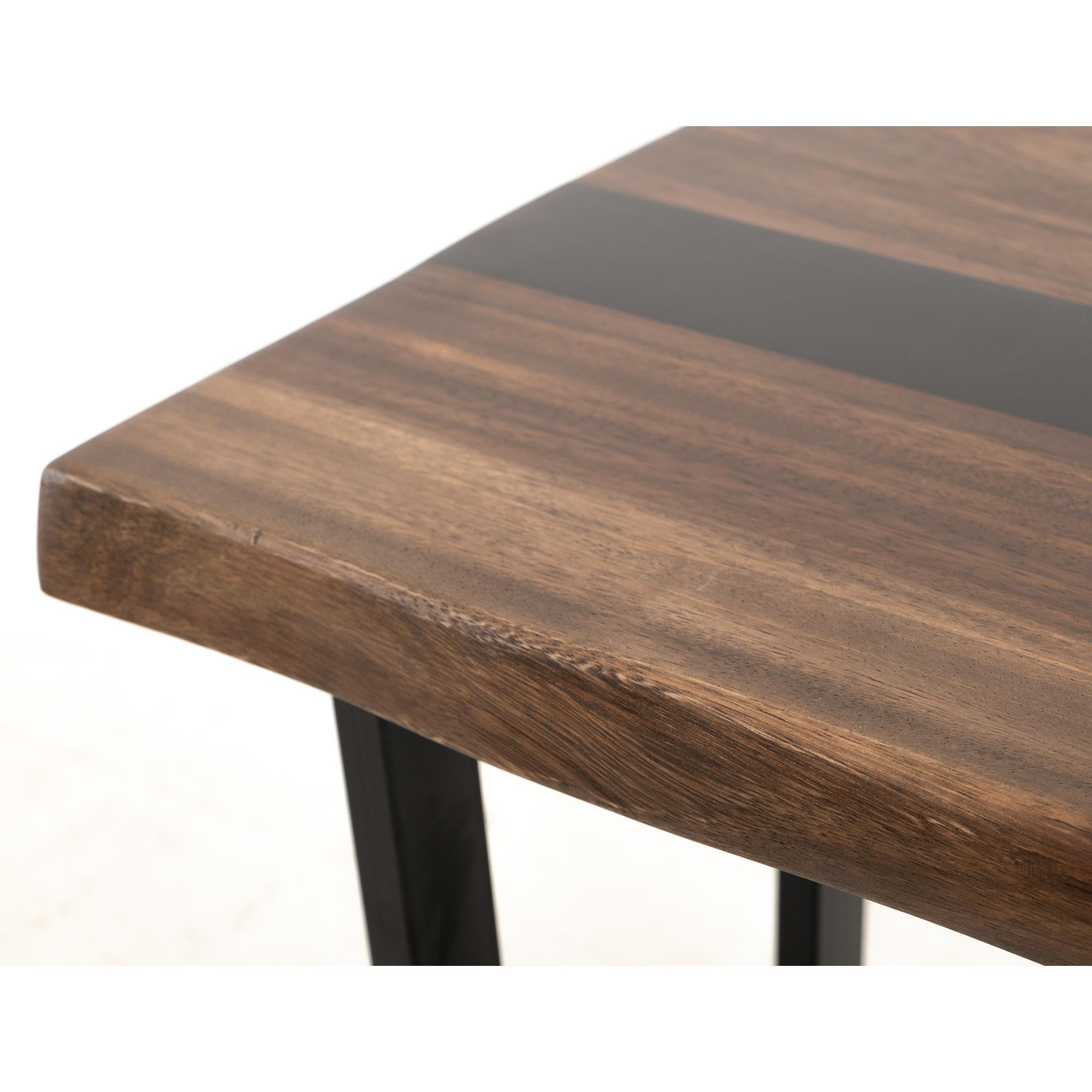 - The table’s top is enhanced with epoxy resin.