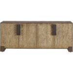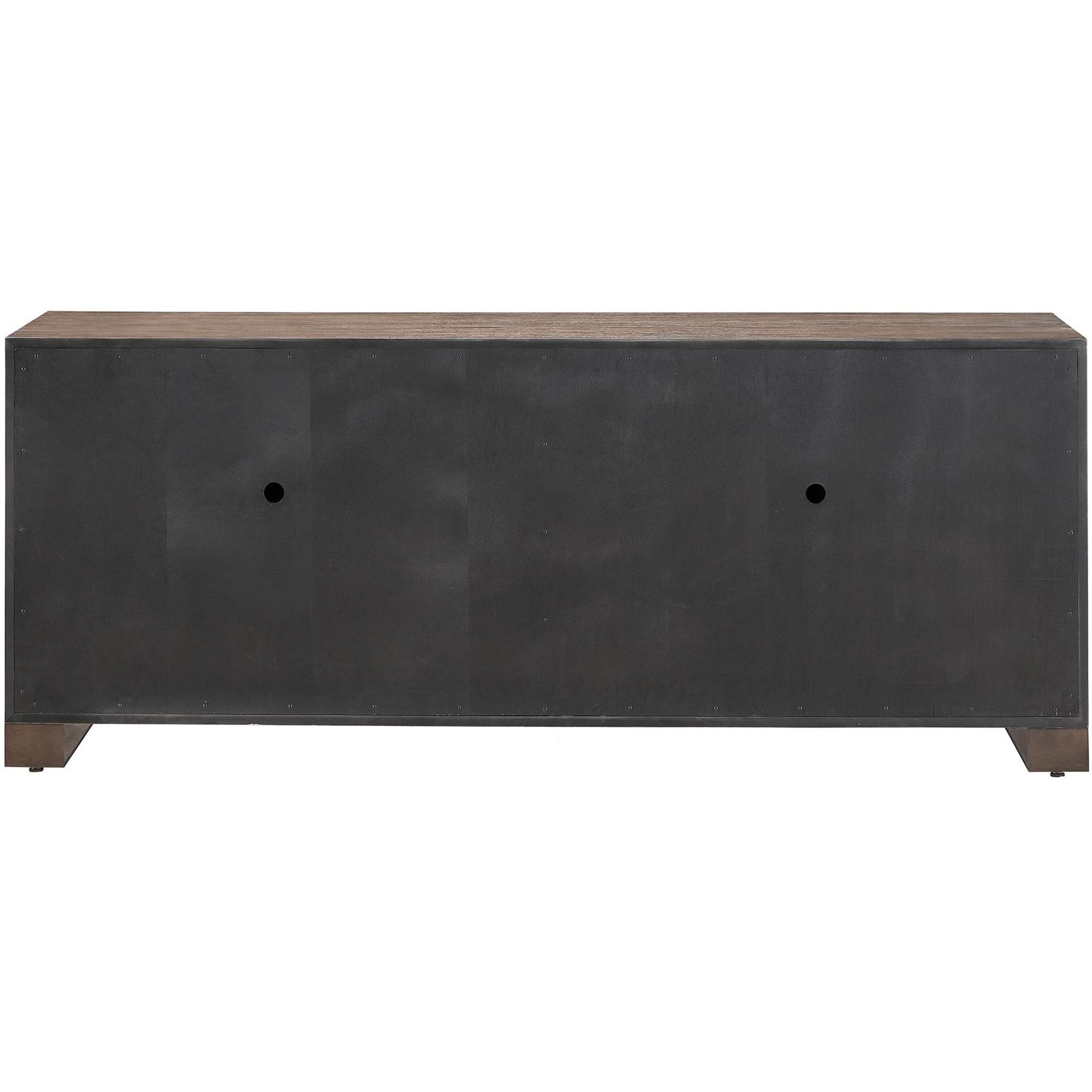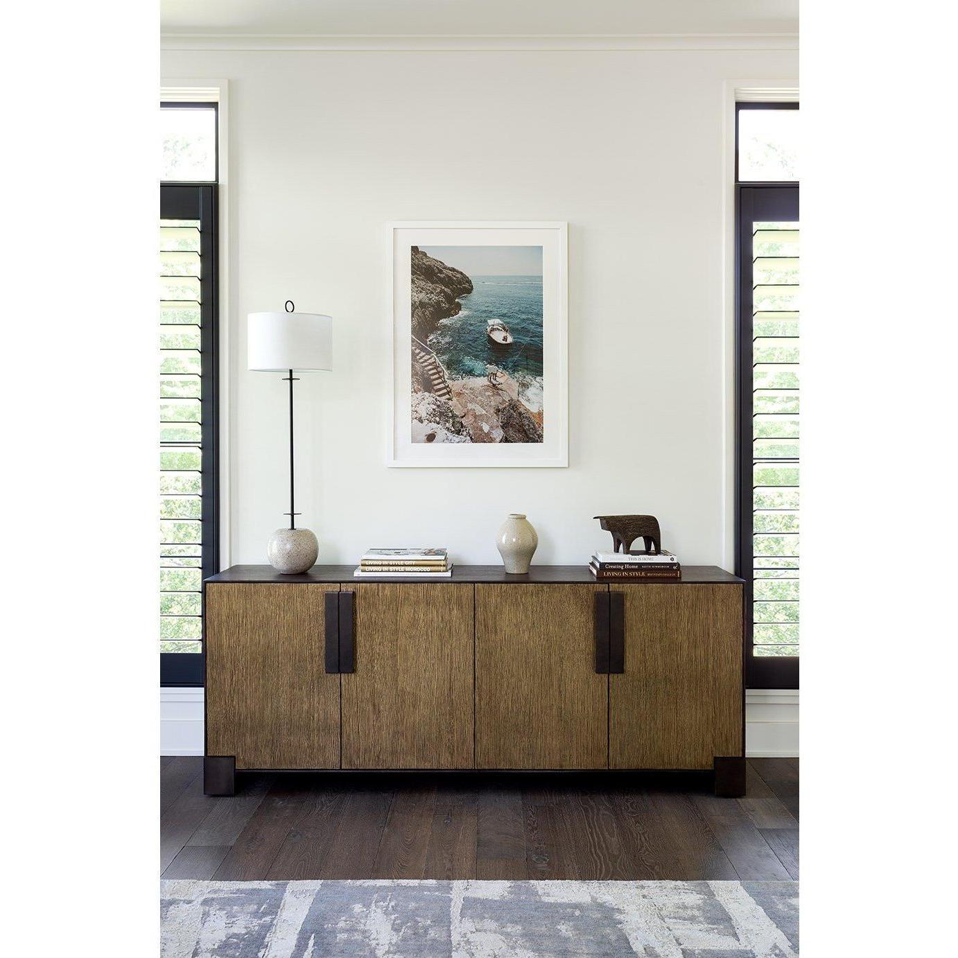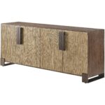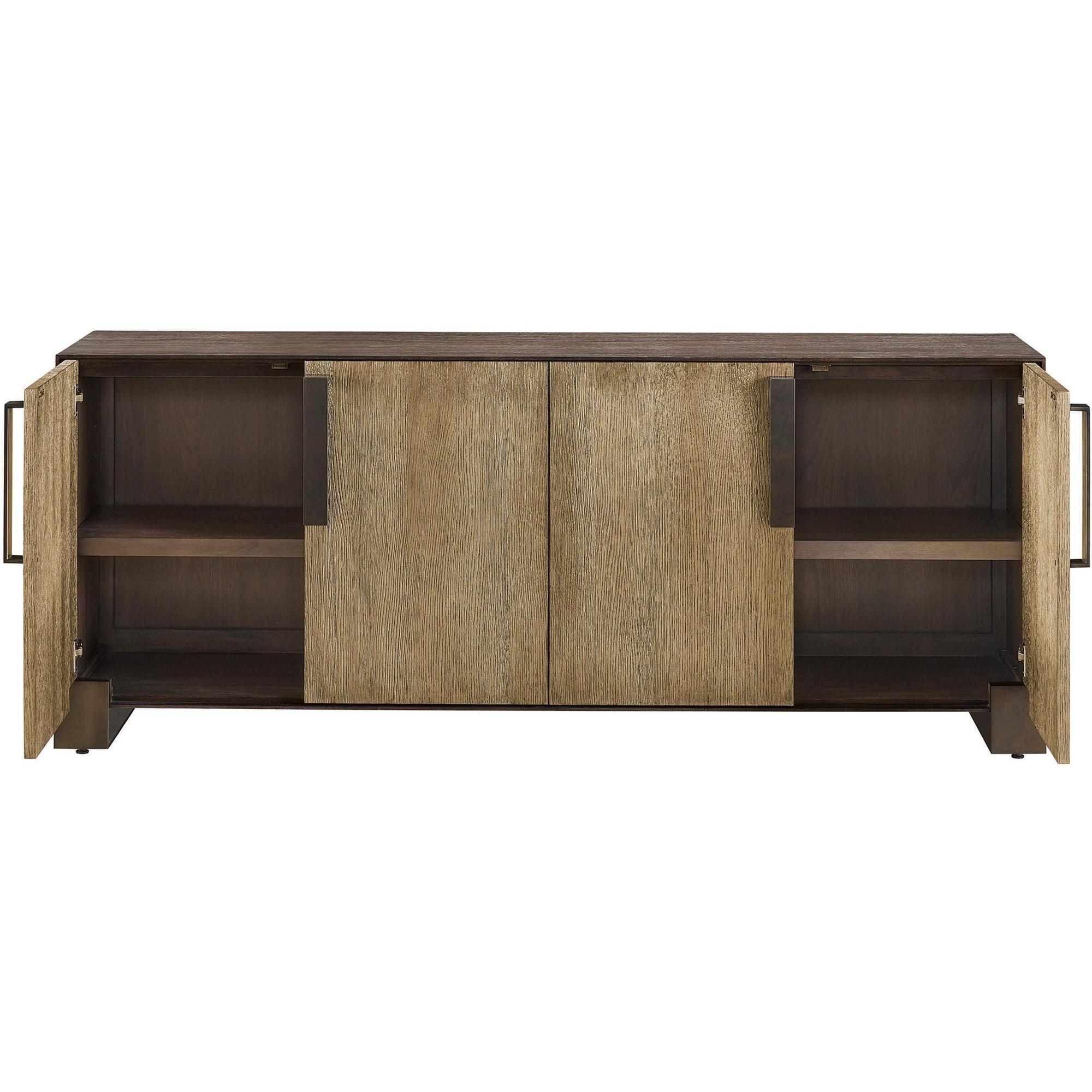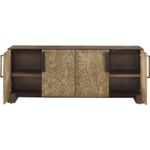 The gilded sandblasted oak doors add a touch of accessible luxury to the dark walnut veneer and satin bronze accents on this spacious console.