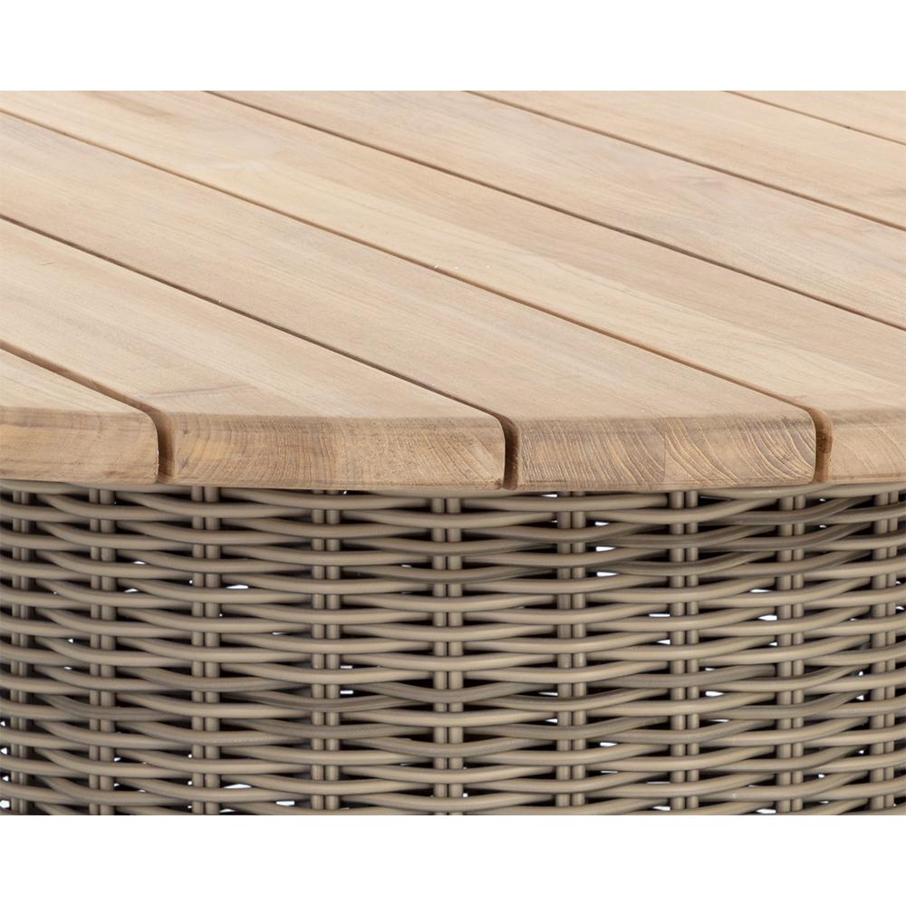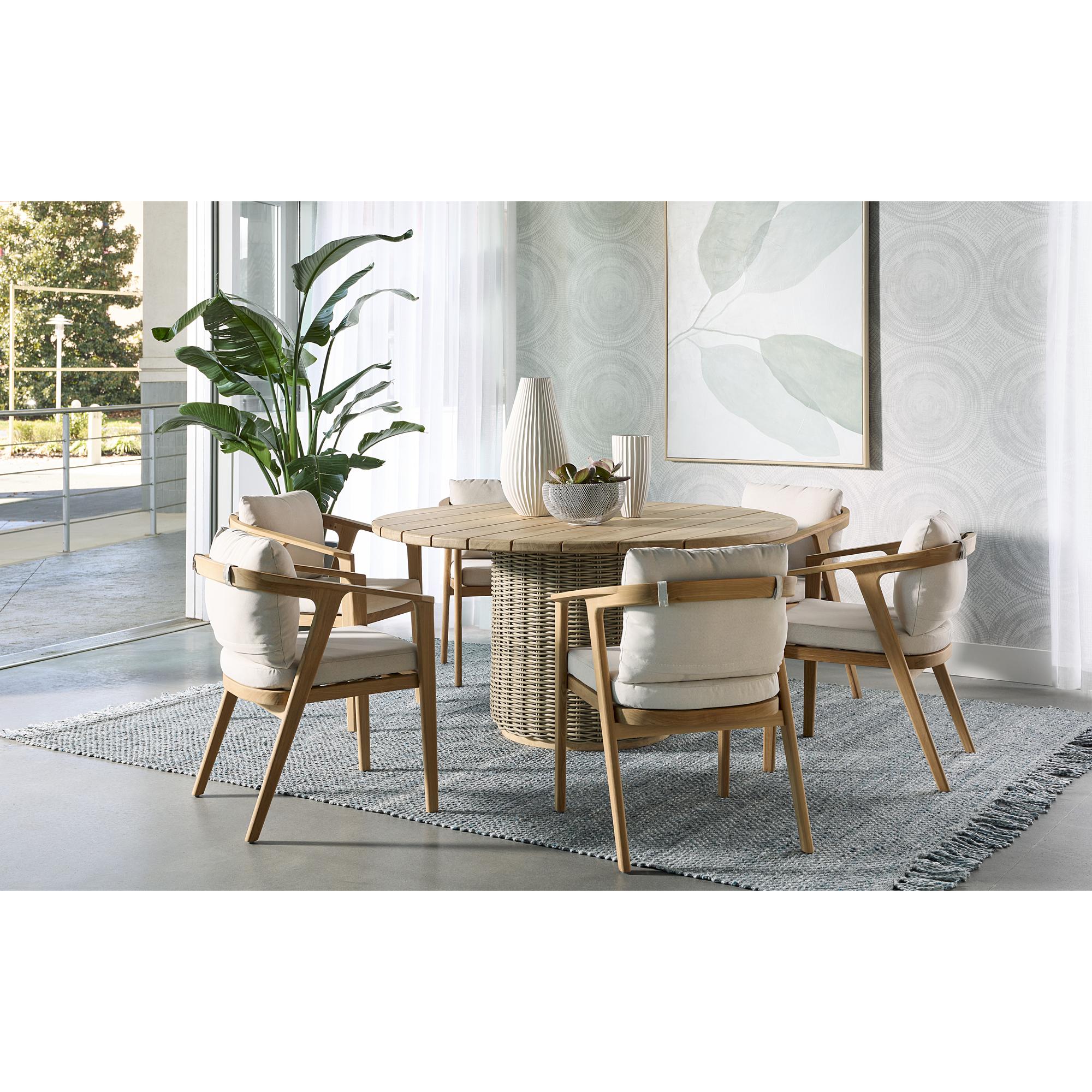 A stunning, round dining table that has modern appeal, infused with a dash of tropical flair. Part of the Outdoor by SUNPAN collection, it features a natural solid teak wood frame and is completed with taupe weave wrapping on the table base. Suitable for indoor and covered outdoor spaces.