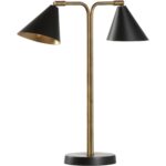 Rizzo Lamp has a mid-century modern design with a cool, retro style. This versatile table lamp features antique brass tubes that bend to form a “T” shape which is the perfect support for the dual black cone shades. Each light adjusts vertically to provide task lighting where needed.