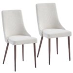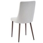 Incorporating a 10mm tempered clear glass tabletop on top of metal legs that have a walnut finish through the process of heat transferring, the illusion of crisscrossing geometric shapes makes this piece a conversation starter. Detailed with chrome-finished glass holders and table feet, this dining table seamlessly blends a fun and visually interesting appearance with a captivating style. Composed of wood, fabric, and metal, this chair is a show stopper all its own. With its curved wood seat frame, seat cushion covered in fabric upholstery, and metal legs emblazoned with a walnut finish through the process of heat transferring, this chair unifies a multitude of elements all into one perfectly composed design. The comfortable seat allows for hours of conversation around the dinner table, while the slim, tapered look of the metal legs have added appeal.