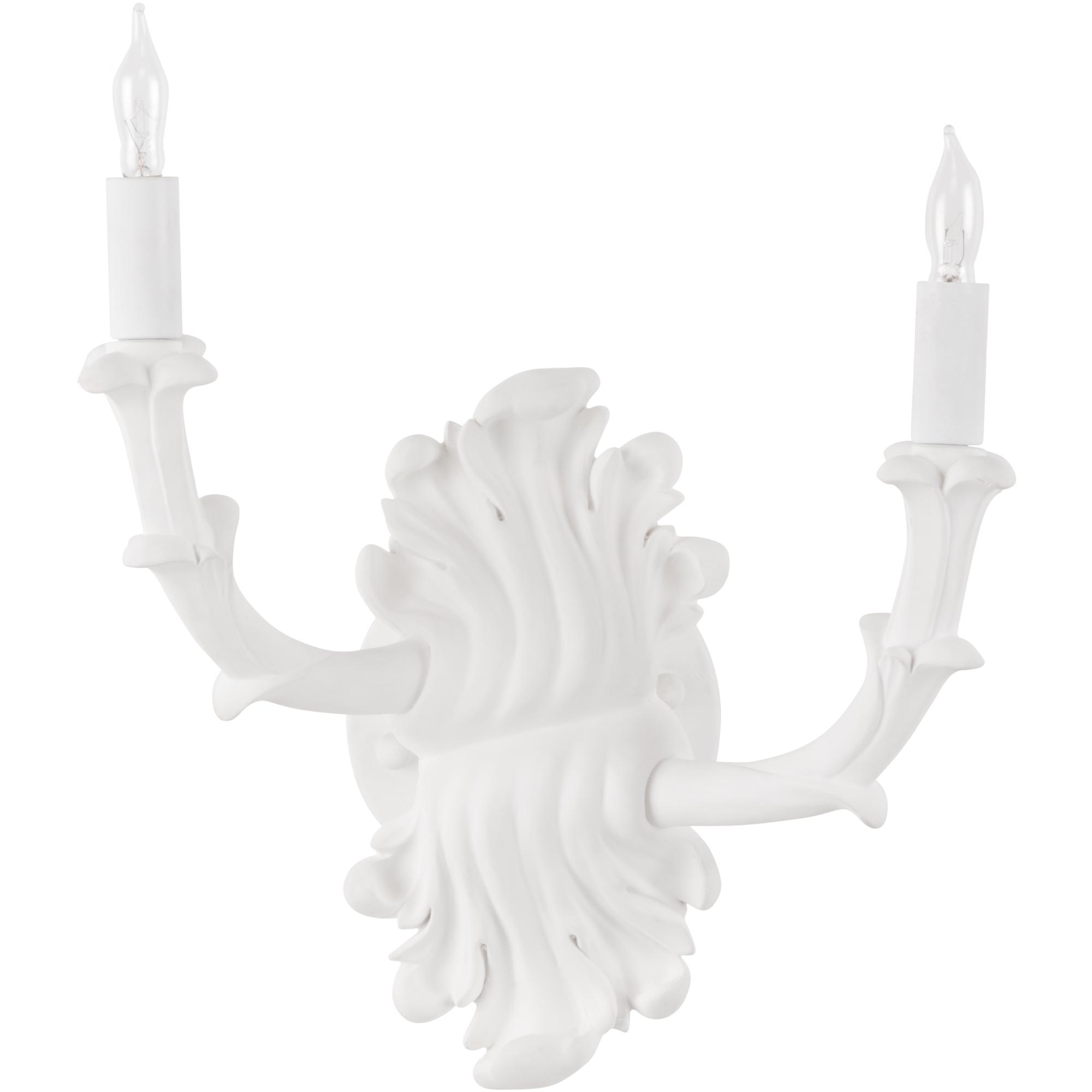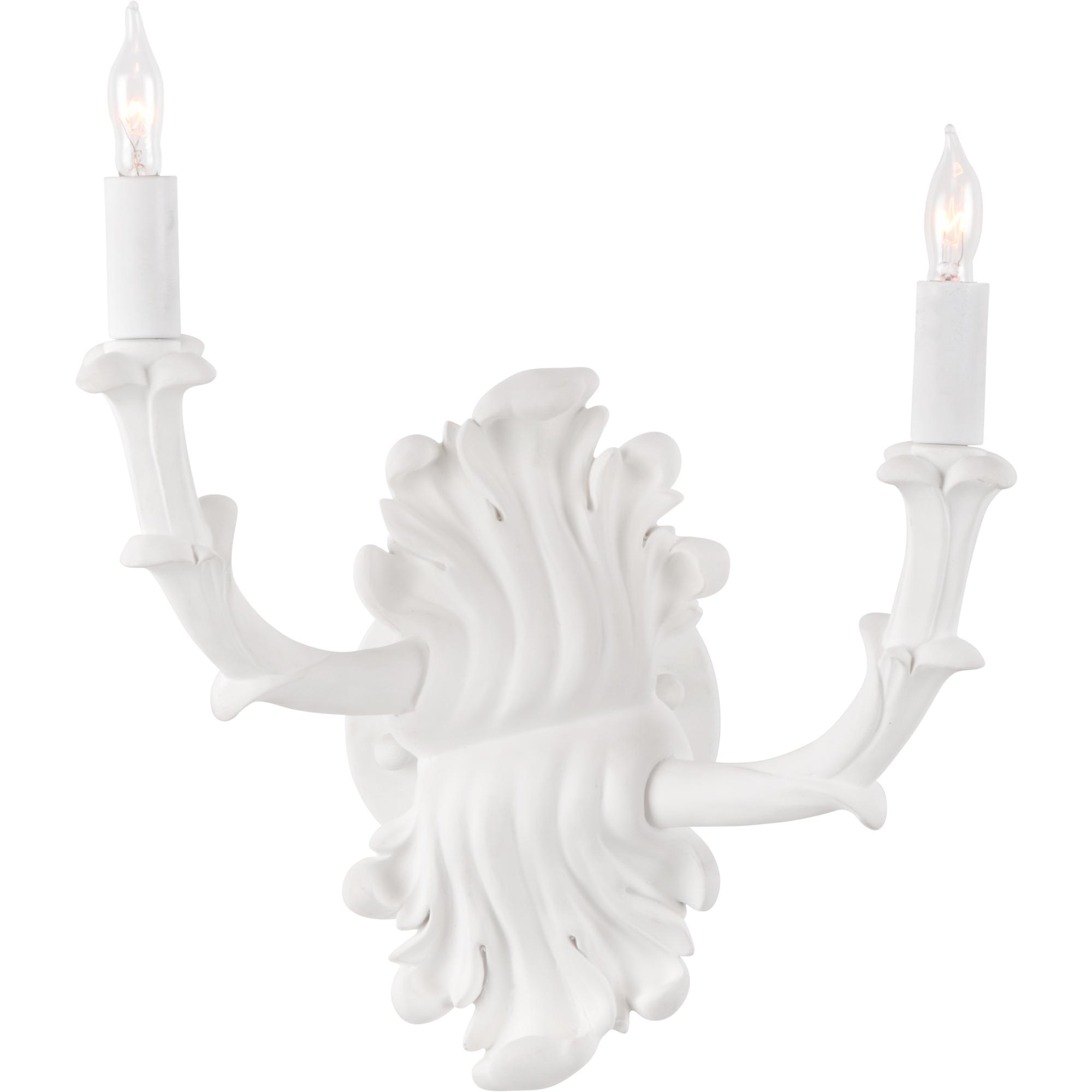 A white plaster finished two arm sconce featuring delicately carved details.