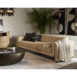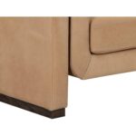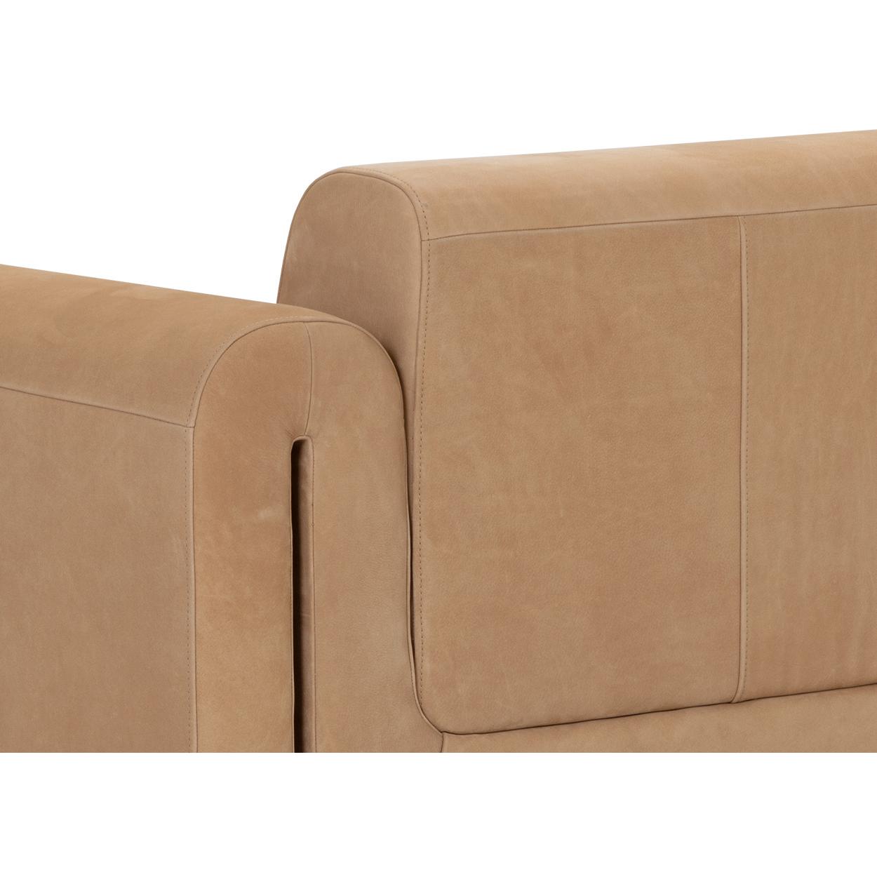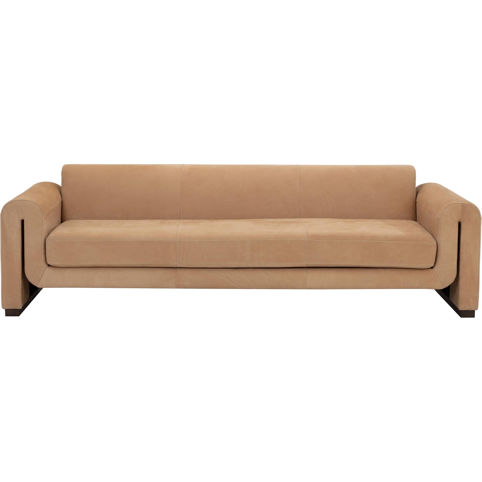 Cozy and luxuriously smooth, the Romer Sofa brings a sense of warmth and comfort to any living area. Expertly designed with sculpted curves that lend a modern aesthetic. Upholstered in nubuck tan leather with brown oak wood legs. Handle with Care: This design has been crafted with 100% leather. Leather is a natural material; as such, colour variations, markings, wrinkles, grooves and light scratches are acceptable and appreciated characteristics. No two pieces are alike. Visit our Product Care page for more information on how to ensure the lasting beauty of this piece.