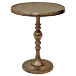 An elegant round table top sits on an ornate carved stem. Made from aluminum, this decorative table features an antiqued brass finish.
