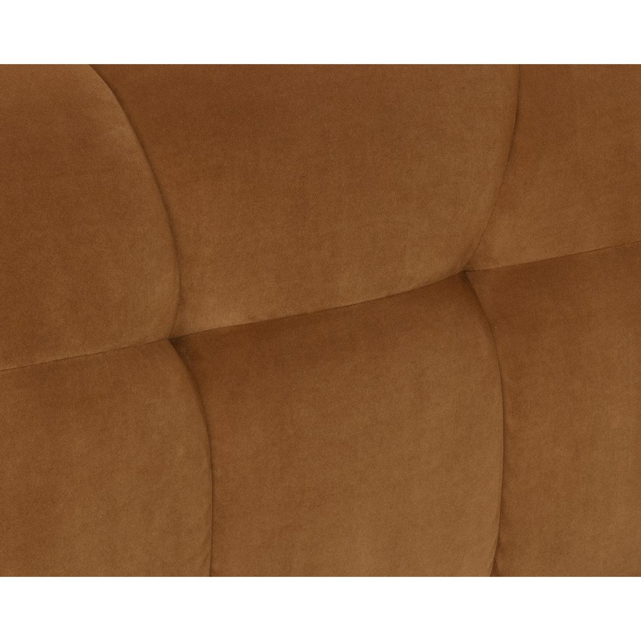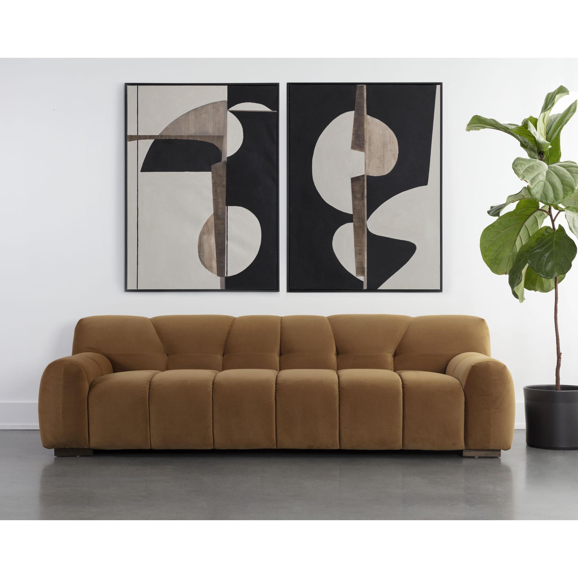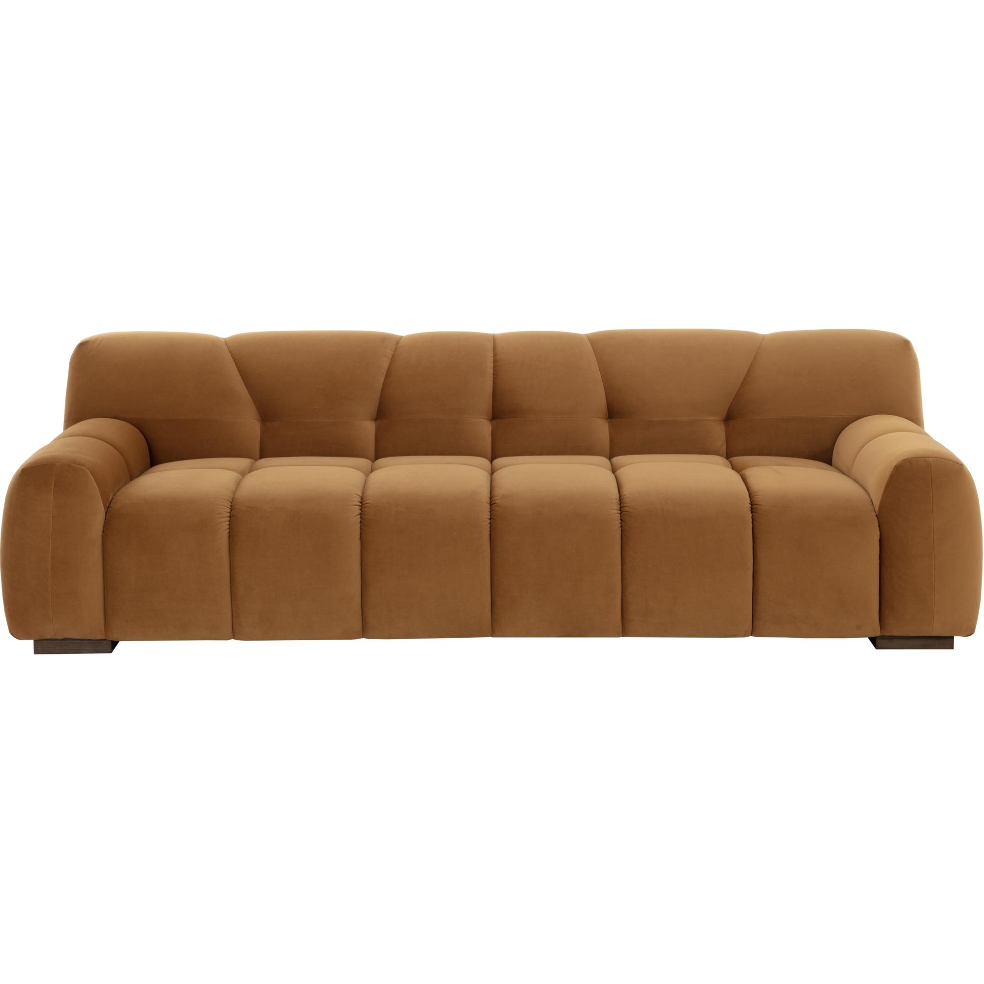 Plush proportions and tufted cushioning bring a visual softness to the Romy Sofa. Generously upholstered in our meg gold fabric with distressed brown birch wood legs for a stunning look that radiates comfort.