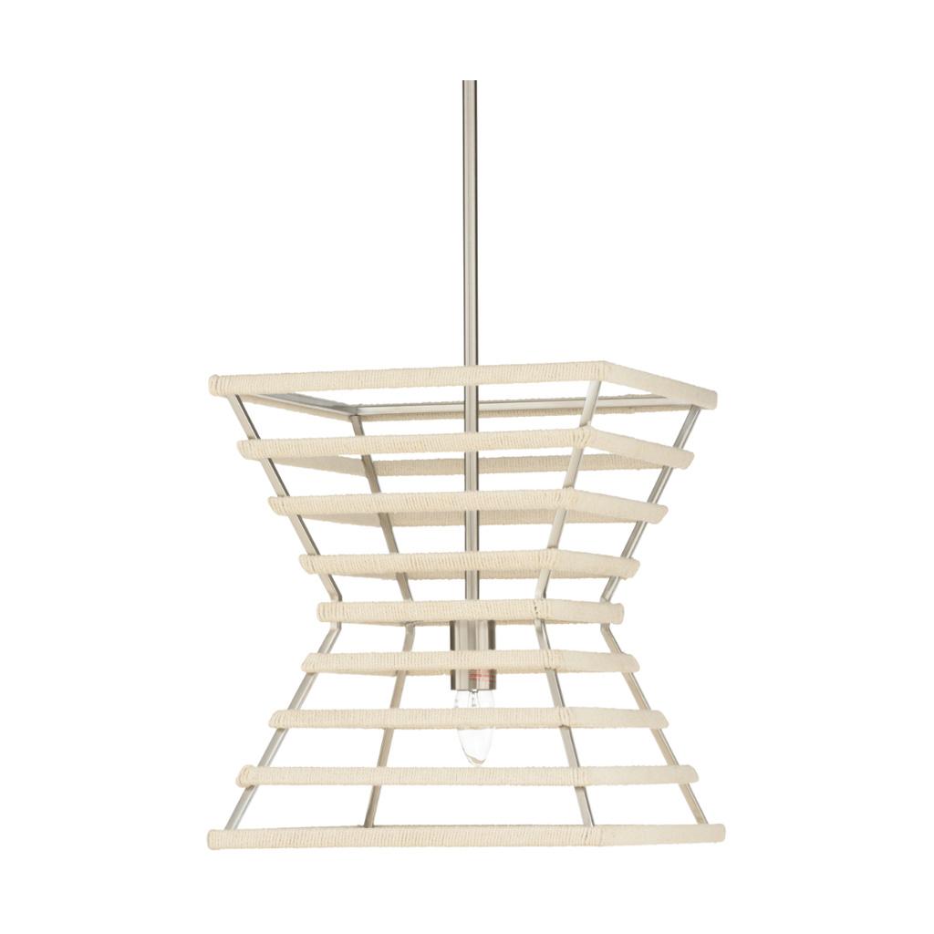 Bold with a sleek silhouette, the Rope Pendant makes a statement with pearlescent white rope wrapped around an hourglass shaped metal base with nickel finishing. It’s the perfect fit for a modern or transitional setting. Designed by Elizabeth Wicker.