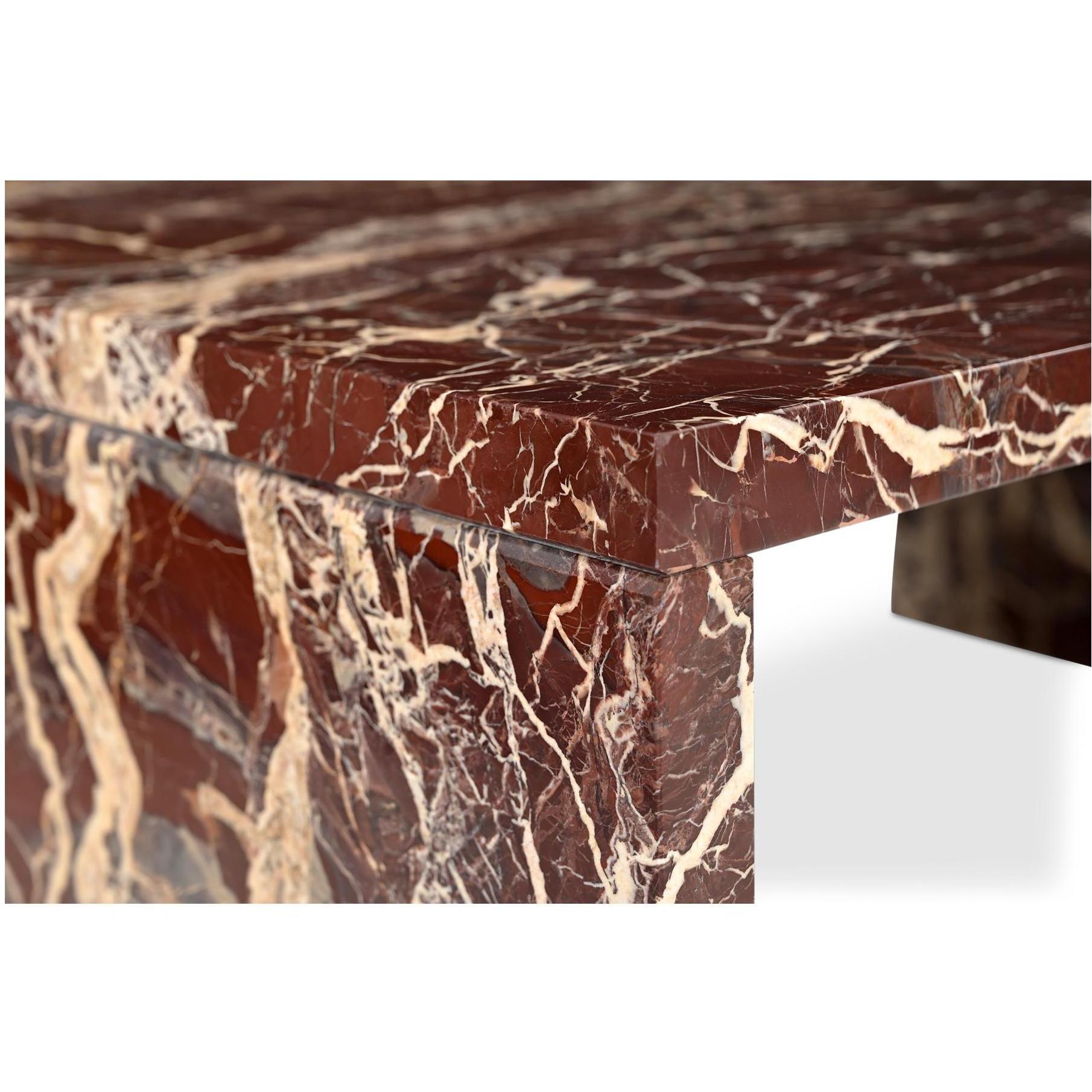 The bold simplicity of the waterfall design speaks volumes with the Rosa coffee table’s versatility. Crafted from beautiful Rosso Levanto marble, renowned for its vibrant red hue and striking gold veining, each piece is singularly impactful. This piece commands attention as a statement of natural elegance.