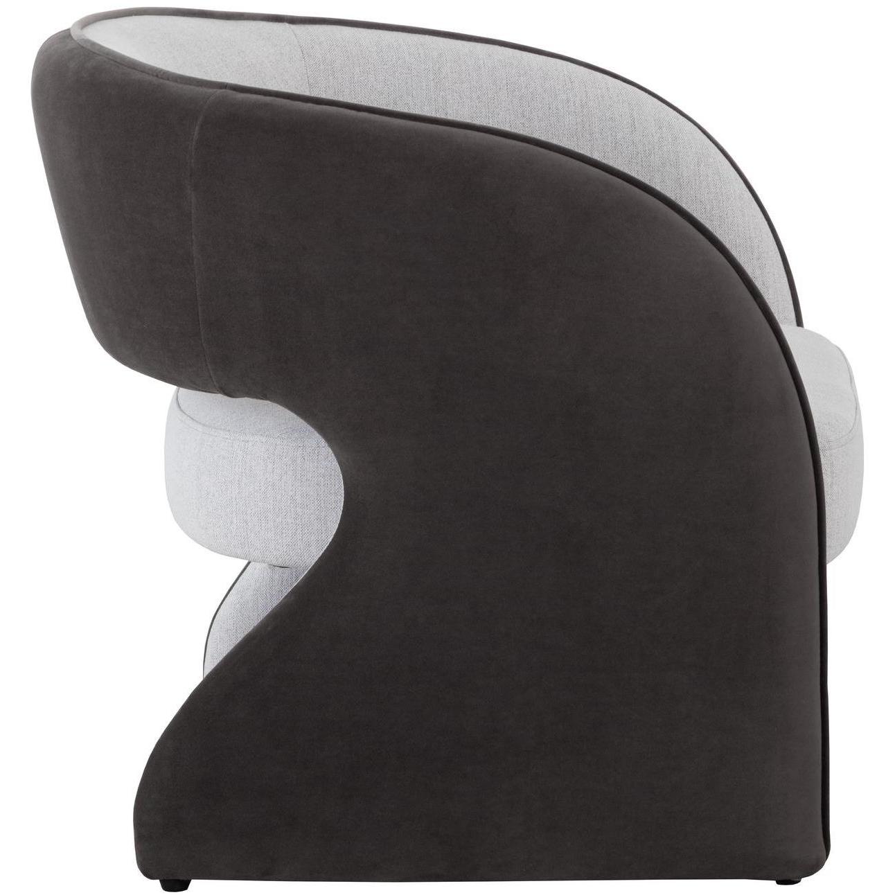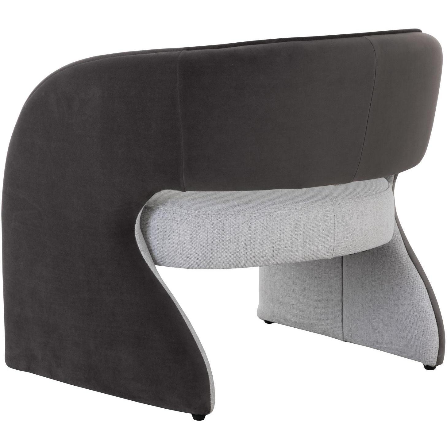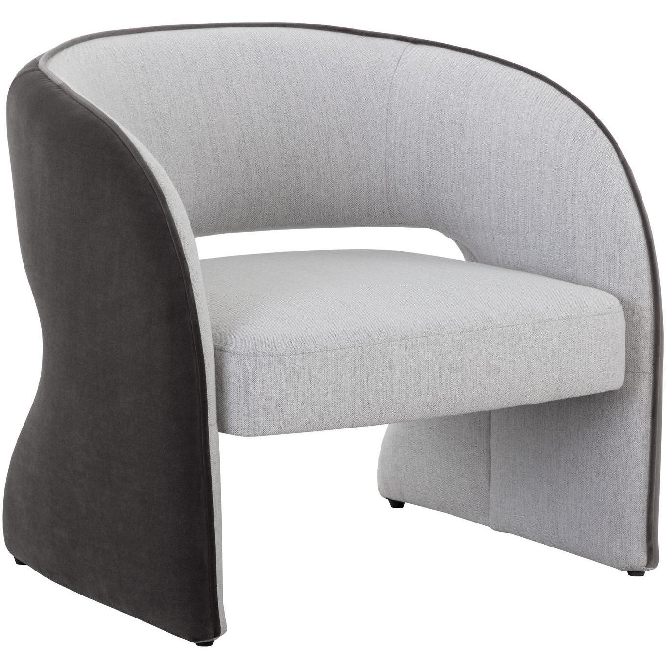Plush curves characterize this contemporary lounge chair. Features a narrow cutout on the back and piping on the edge for extra definition. This two-toned combination features an interior upholstered in mina light grey fabric and an exterior in meg ash fabric. Also available in a timeless teal fabric and a meg rust fabric.
