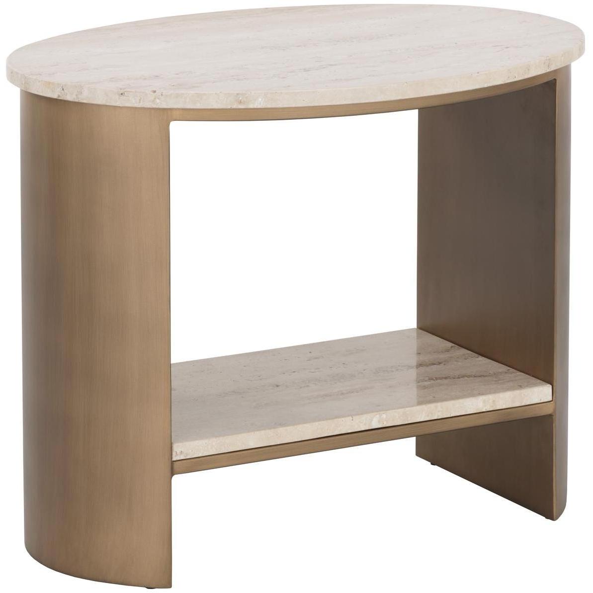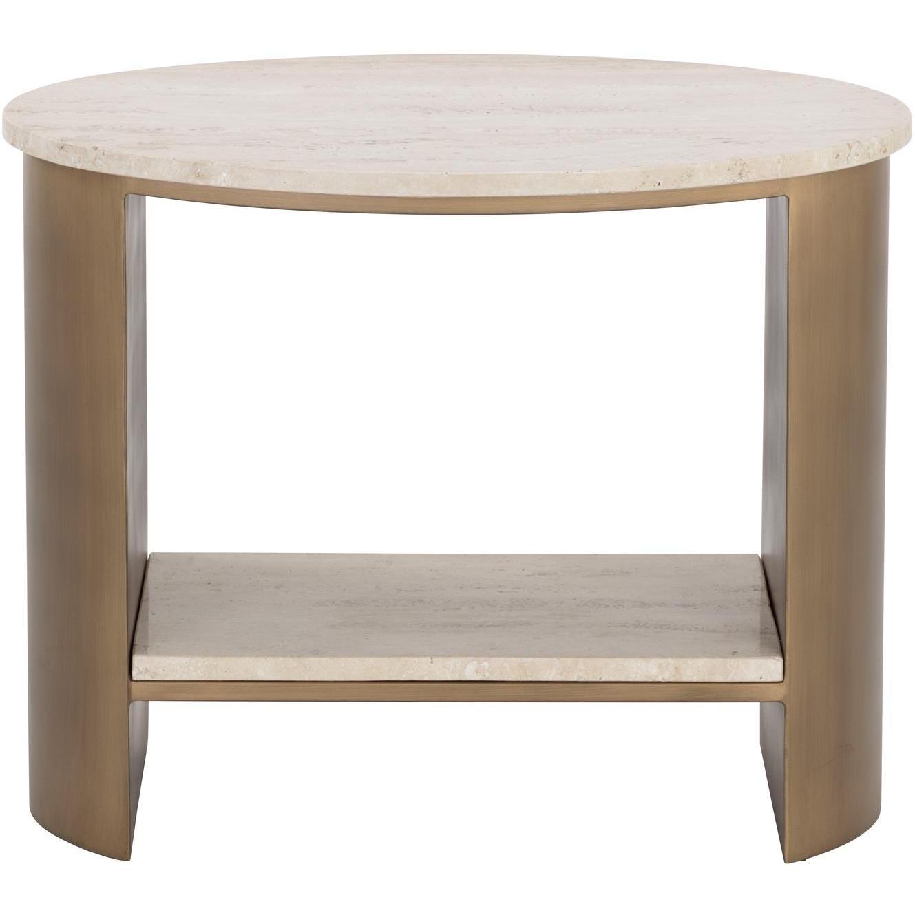 Versatile and timeless, the Roshni End Table will fit any setting. A natural travertine shelf and tabletop brings added warmth to the mid-century modern design. Completed with a powder-coated antique gold iron base.