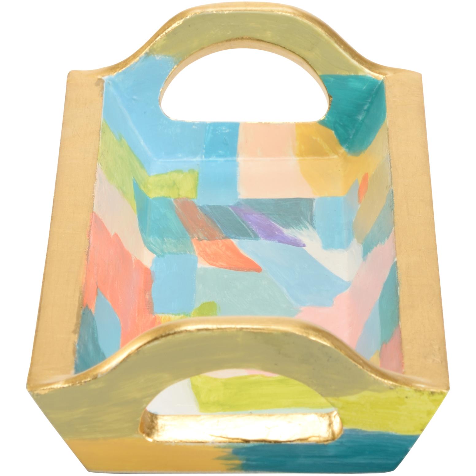 Hand painted wood tray in vibrant colors with antique gold leaf exterior and cut out handles. Beautiful as a decorative accessory and functional as a catchall for daily essentials such as phone, wallet and keys. Designed by Elaine Burge.