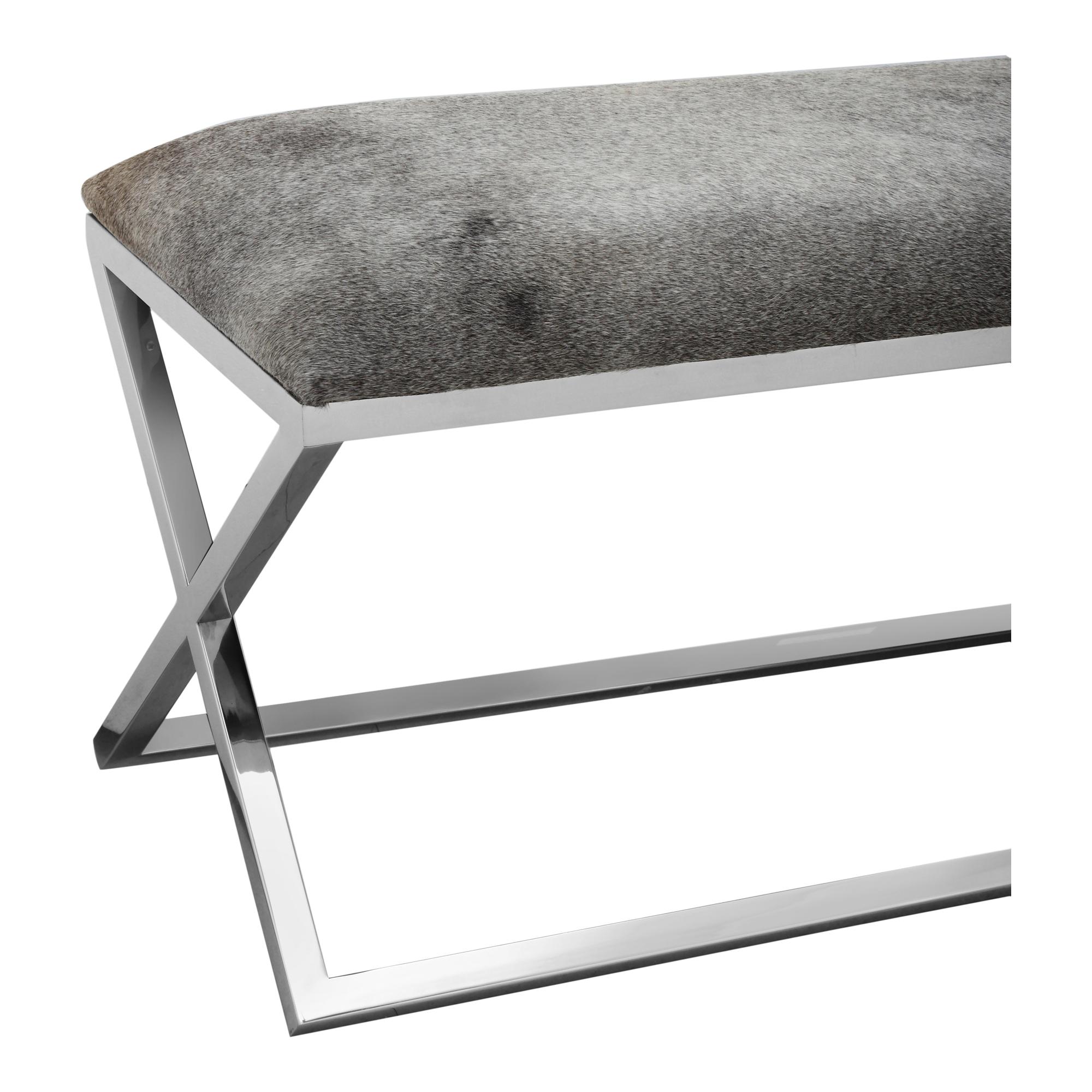Glam by design, the Rossi Bench brings a luxurious statement to your space. With a solid stainless steel frame and cow hide upholstery, it is a great addition to your glam entry or living space.