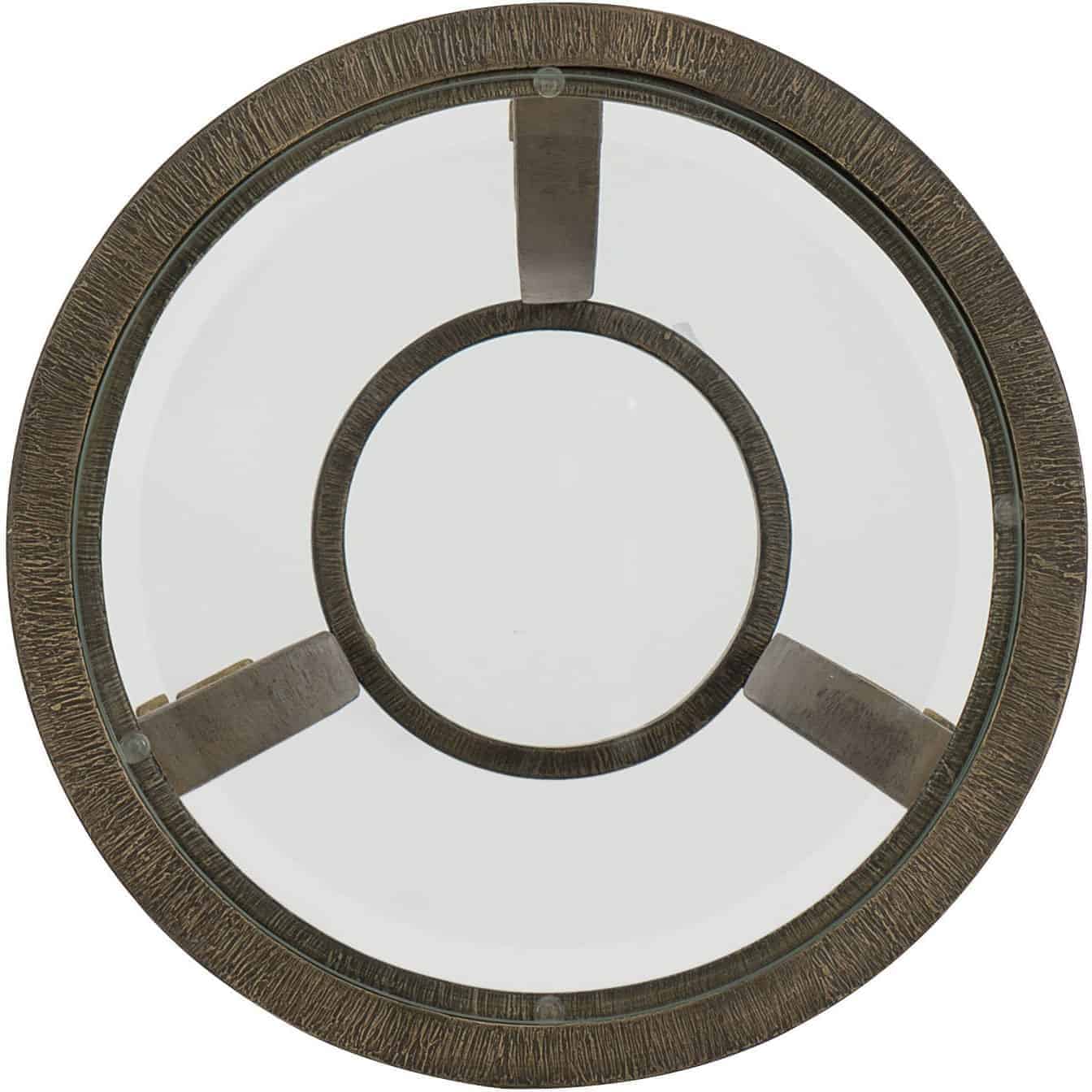 - Finish: Antique gold metal frame with textured accents around the top edge and ring stretcher