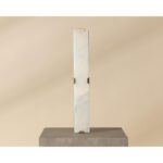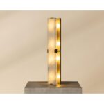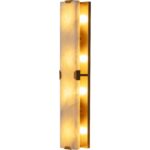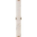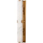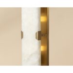 The Rovira Sconce is an artful examination of the beauty of natural stone. A long, hand carved panel of alabaster imported from Spain is fixed onto of a brushed gold iron base for a dazzling design. The translucent nature of alabaster allows light to flow through, emitting a soft ambient glow. When lit, this design truly comes to life. As alabaster is a natural material, unique veining and colour variations are all characteristics that add to the uniqueness and beauty of each piece.