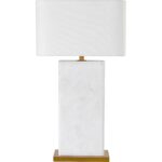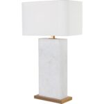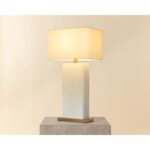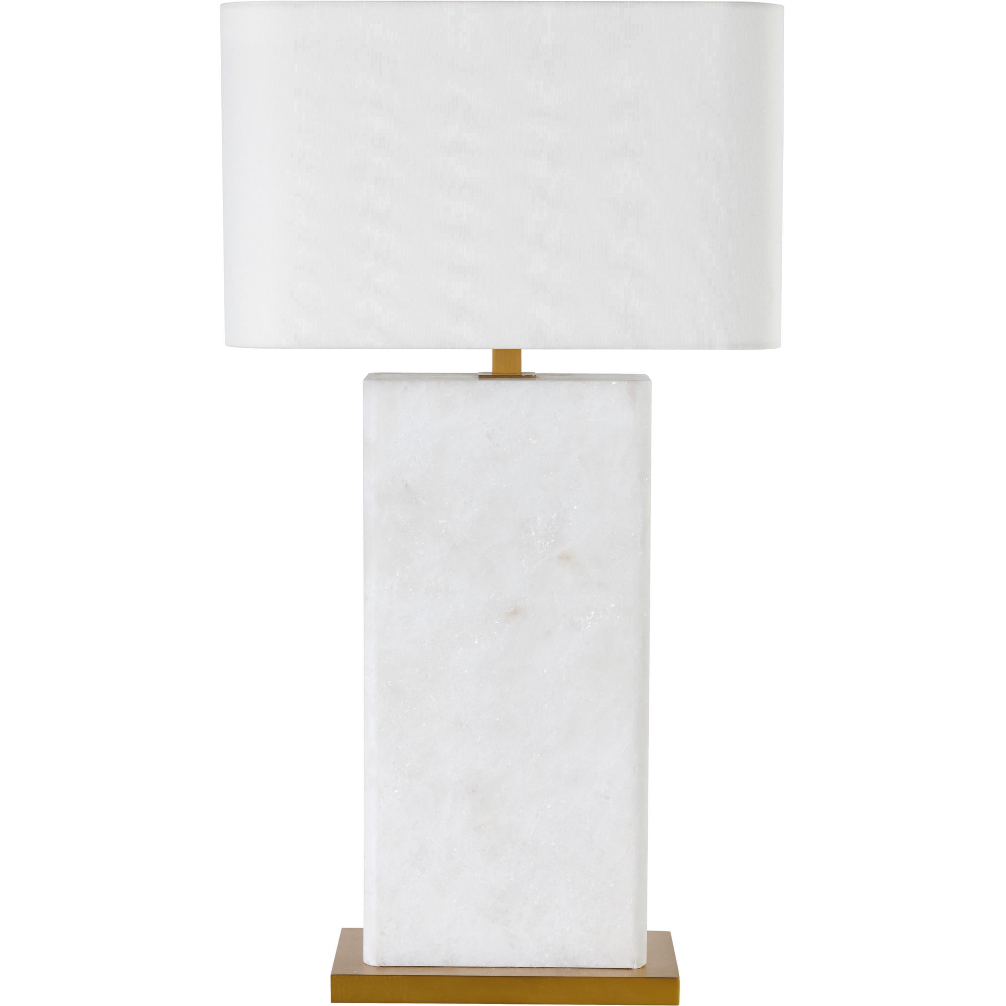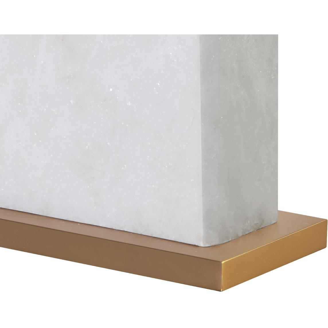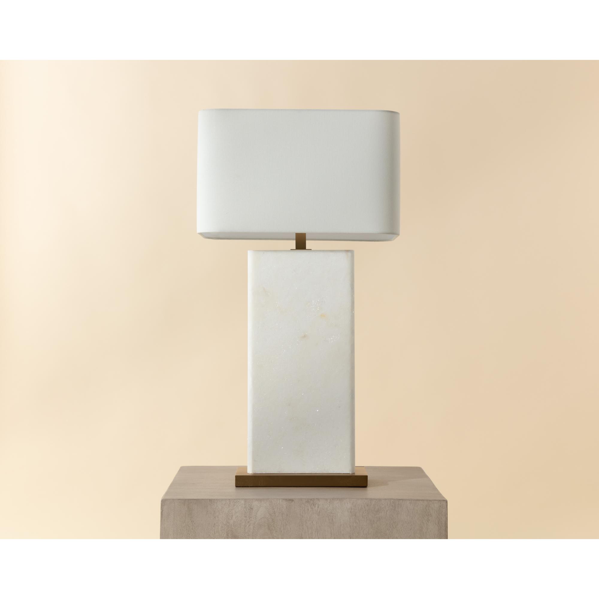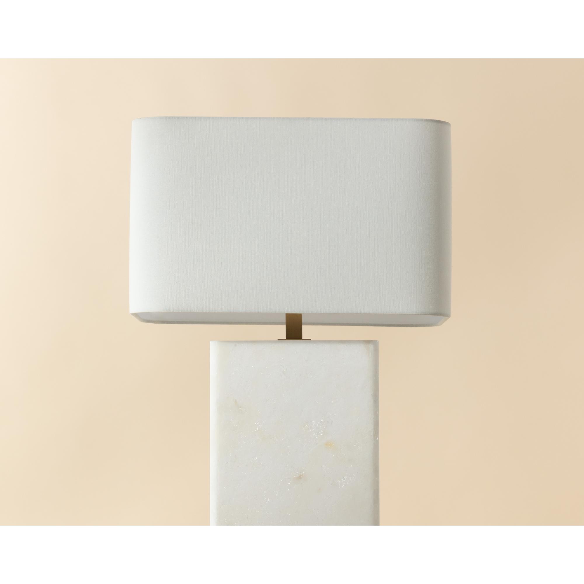 The Rovira Table Lamp is an artful examination of the beauty of natural stone. A thick, hand carved panel of alabaster imported from Spain is displayed on top of a brushed gold iron base for a dazzling design. An off-white linen shade complements the look. The translucent nature of alabaster allows light to flow through, emitting a soft ambient glow. When lit, this design truly comes to life. As alabaster is a natural material, unique veining and colour variations are all characteristics that add to the uniqueness and beauty of each piece.