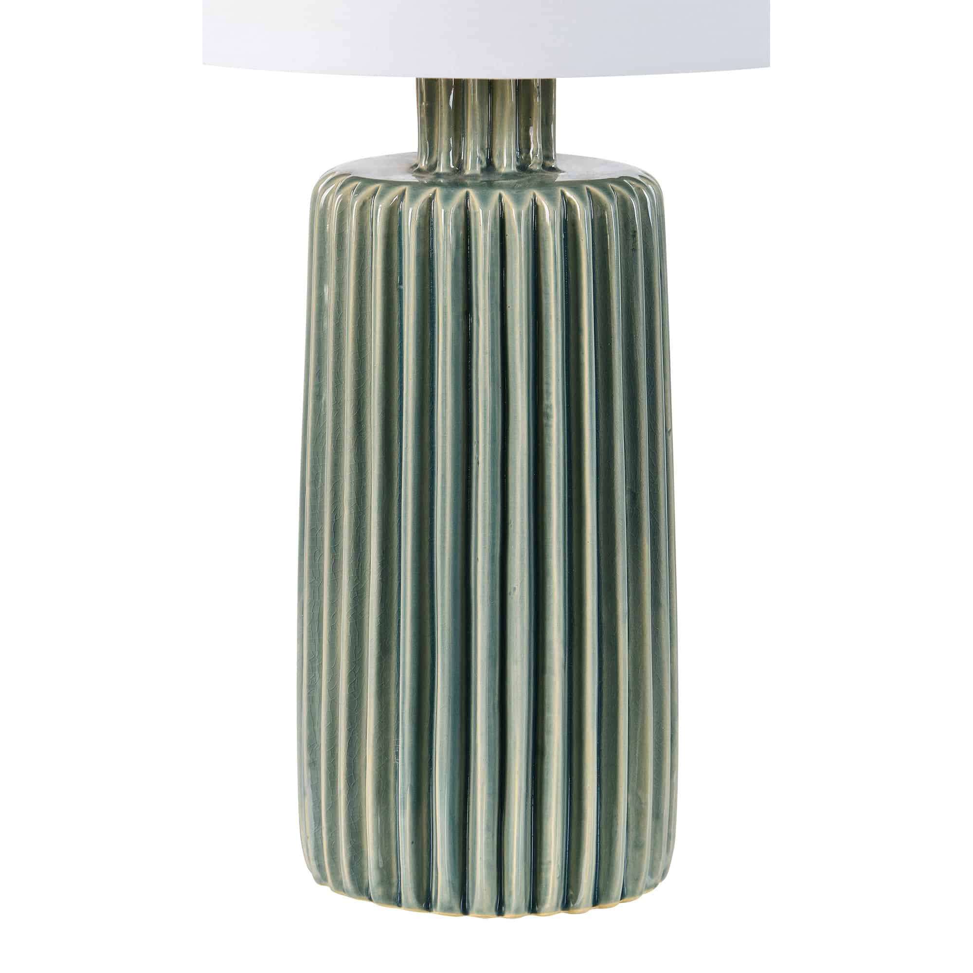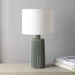 A warm olive tone captivates day or night in this table lamp design. At once current and timeless, clients will find this table lamp feels like the finishing touch in their bedroom, home office, or living space. The ceramic table lamp’s ribbed details and off-white shade come together magnificently to offer function and fashion to contemporary and mid-century modern interiors.