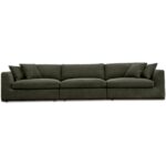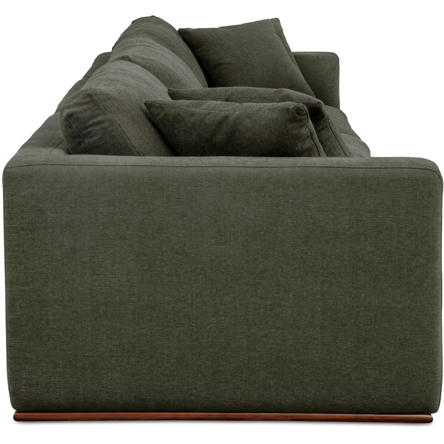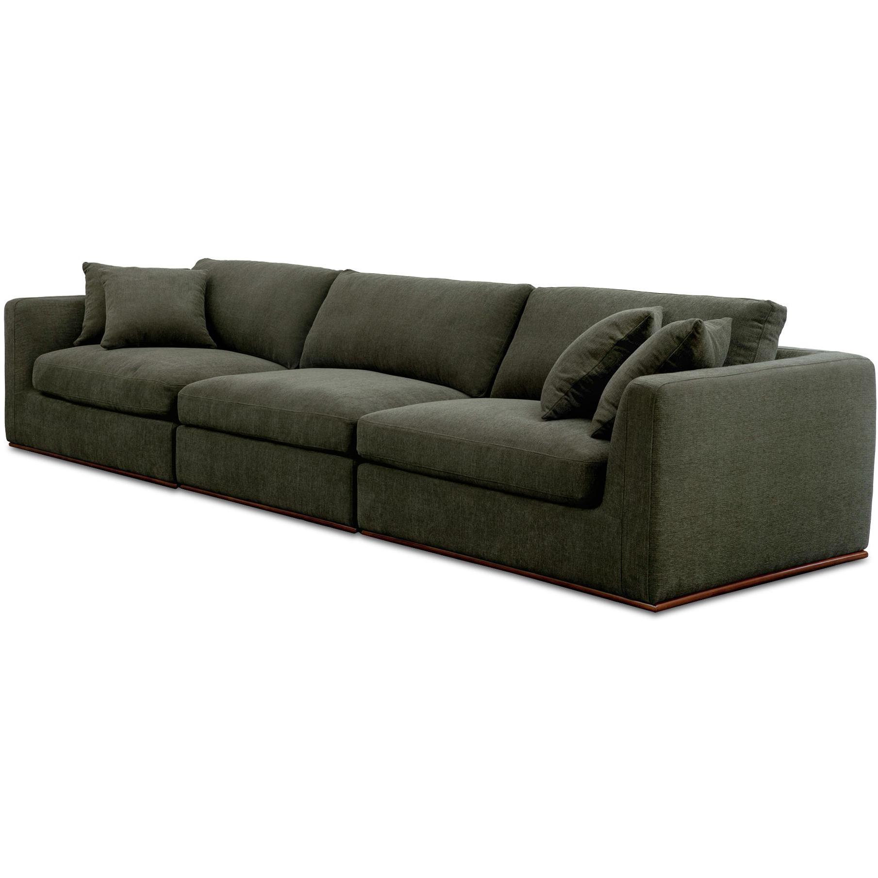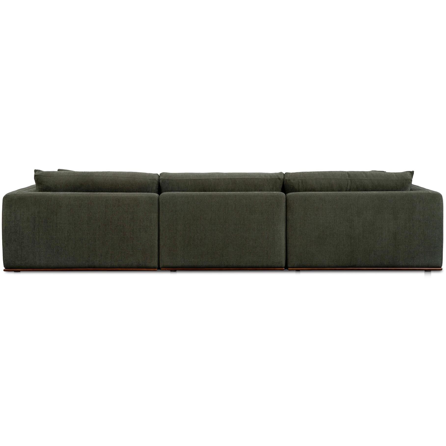 The Rue modular sectional features a generous 70% feather-fill topper within its seating, accompanied by toss cushions for an added layer of coziness. Its elegant silhouette is highlighted by a rubber wood base, creating a sleek floating appearance, all supported by subtle wooden legs. Designed with extreme comfort in mind, this modular embodies easy, neutral styling.