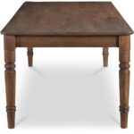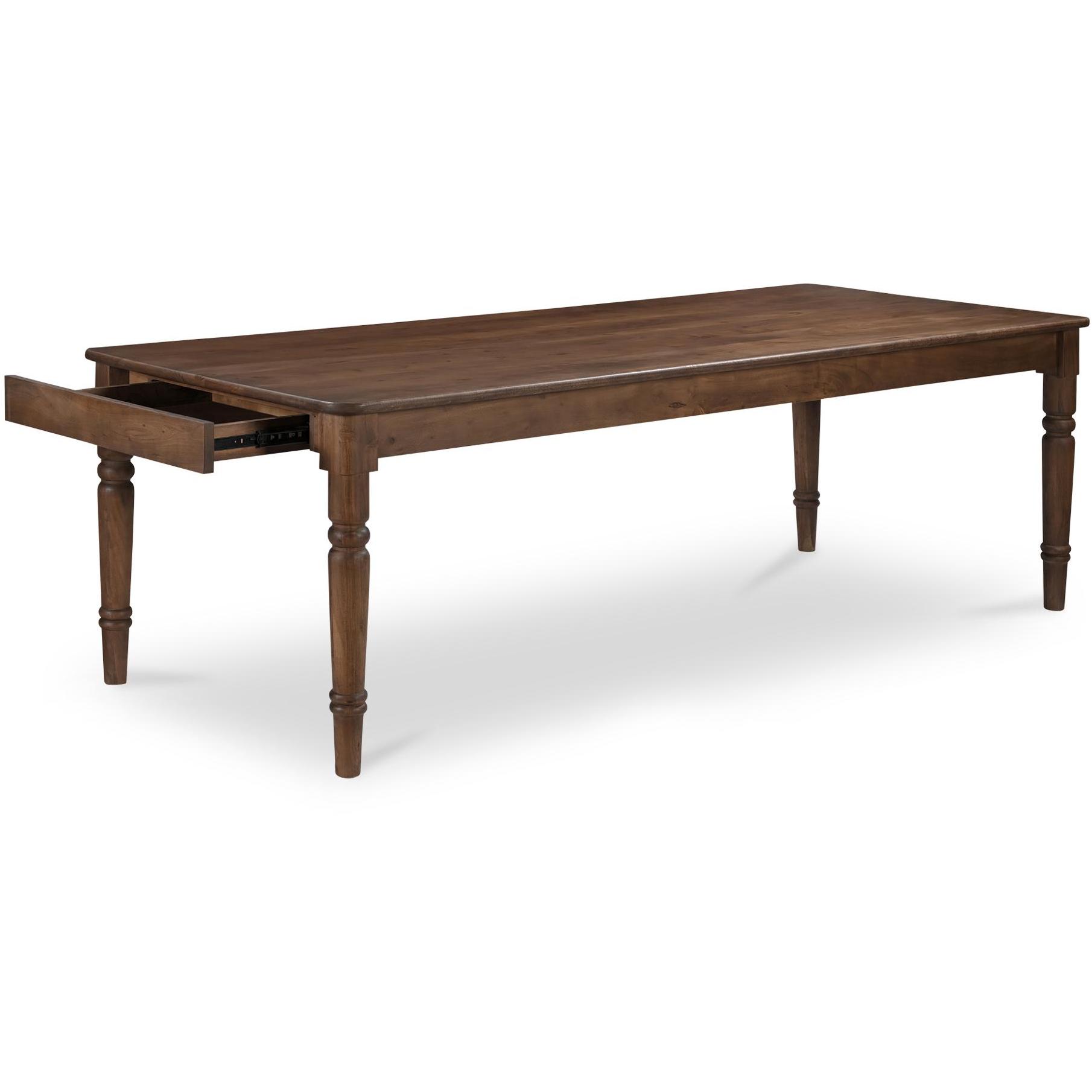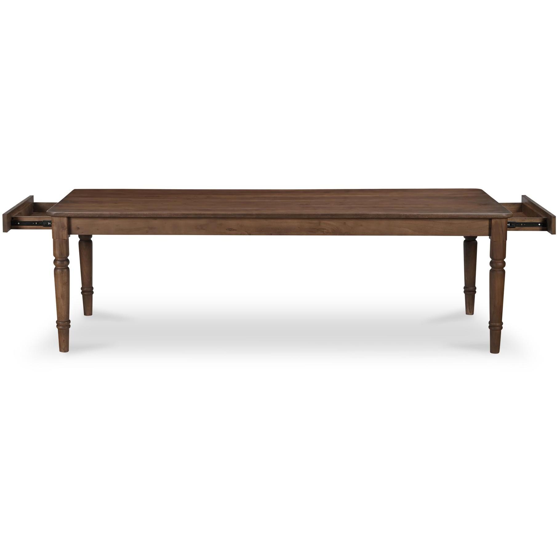 The Russet dining table features beautifully turned legs, intricately carved details, and a mid-tone brown finish that fits seamlessly into traditional and transitional homes. Adding to its charm are two horizontal drawers at each end for convenient storage, complemented by an overhanging tabletop that enhances its classic aesthetic–a timeless centerpiece, enriching the dining experience with style and functionality.