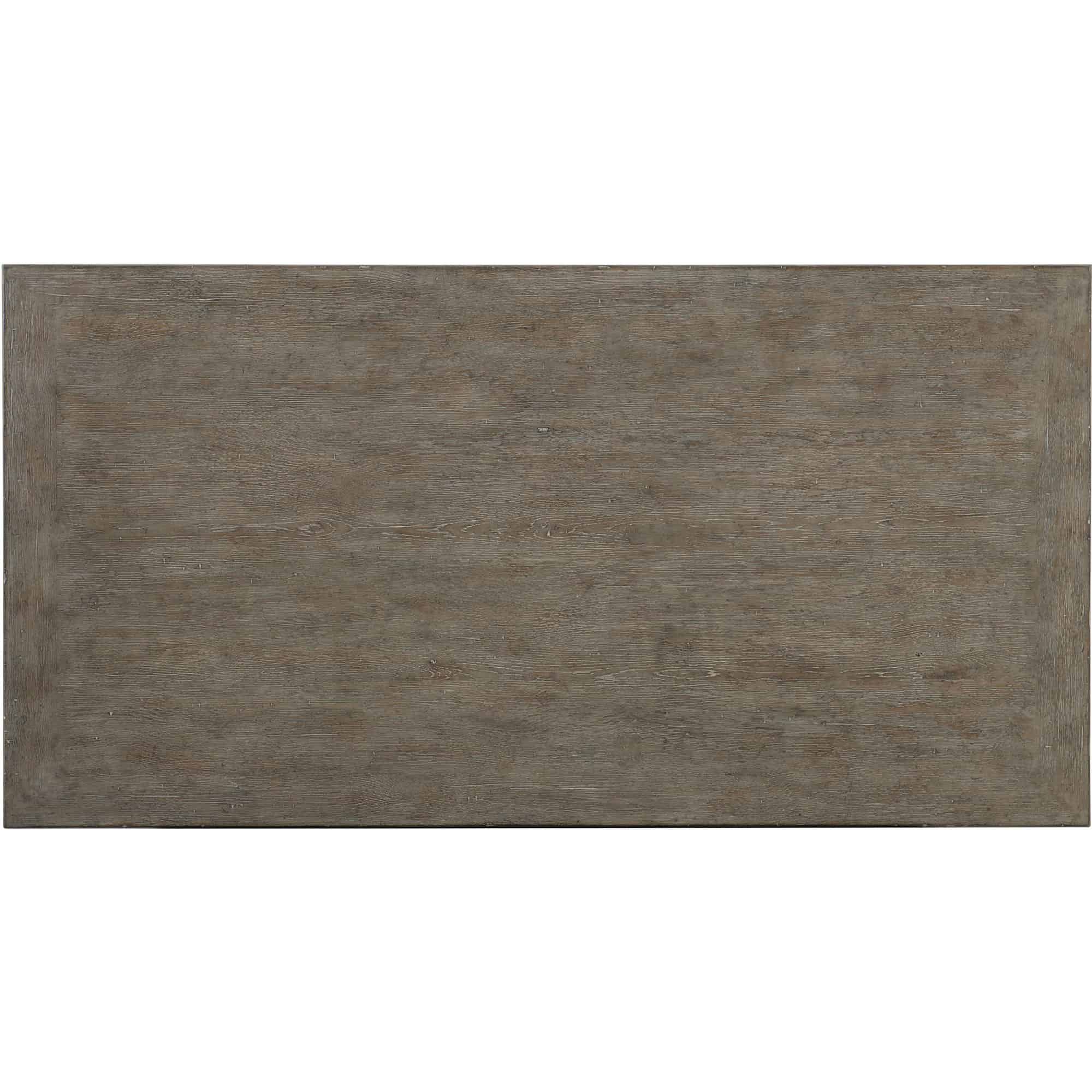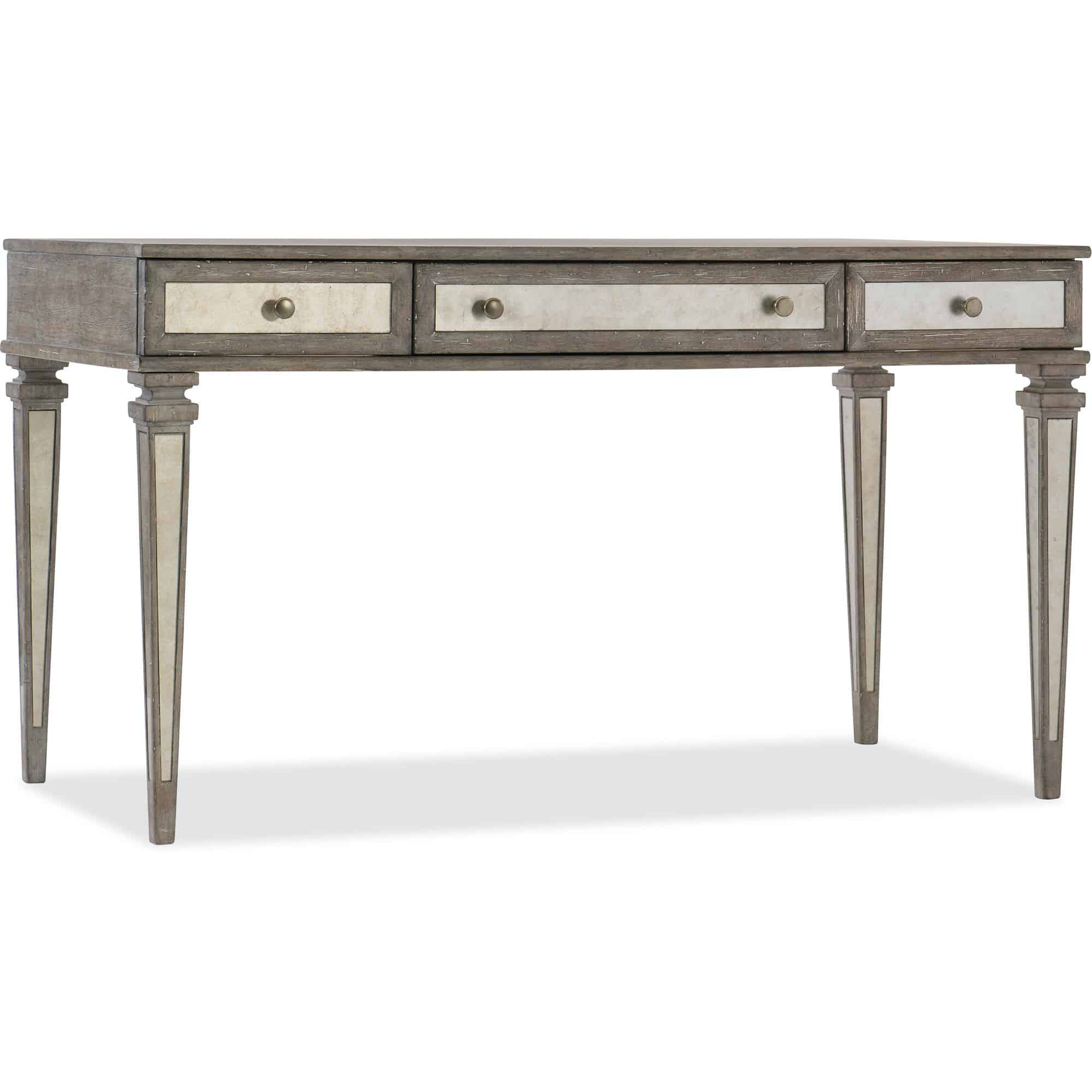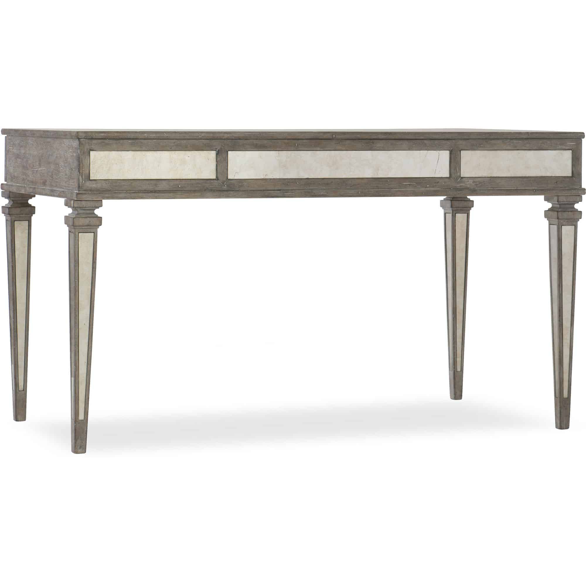 Finish: Eglomise glass accents, medium wood finish with distressing including antiquing, wire brush, gouging and rasping