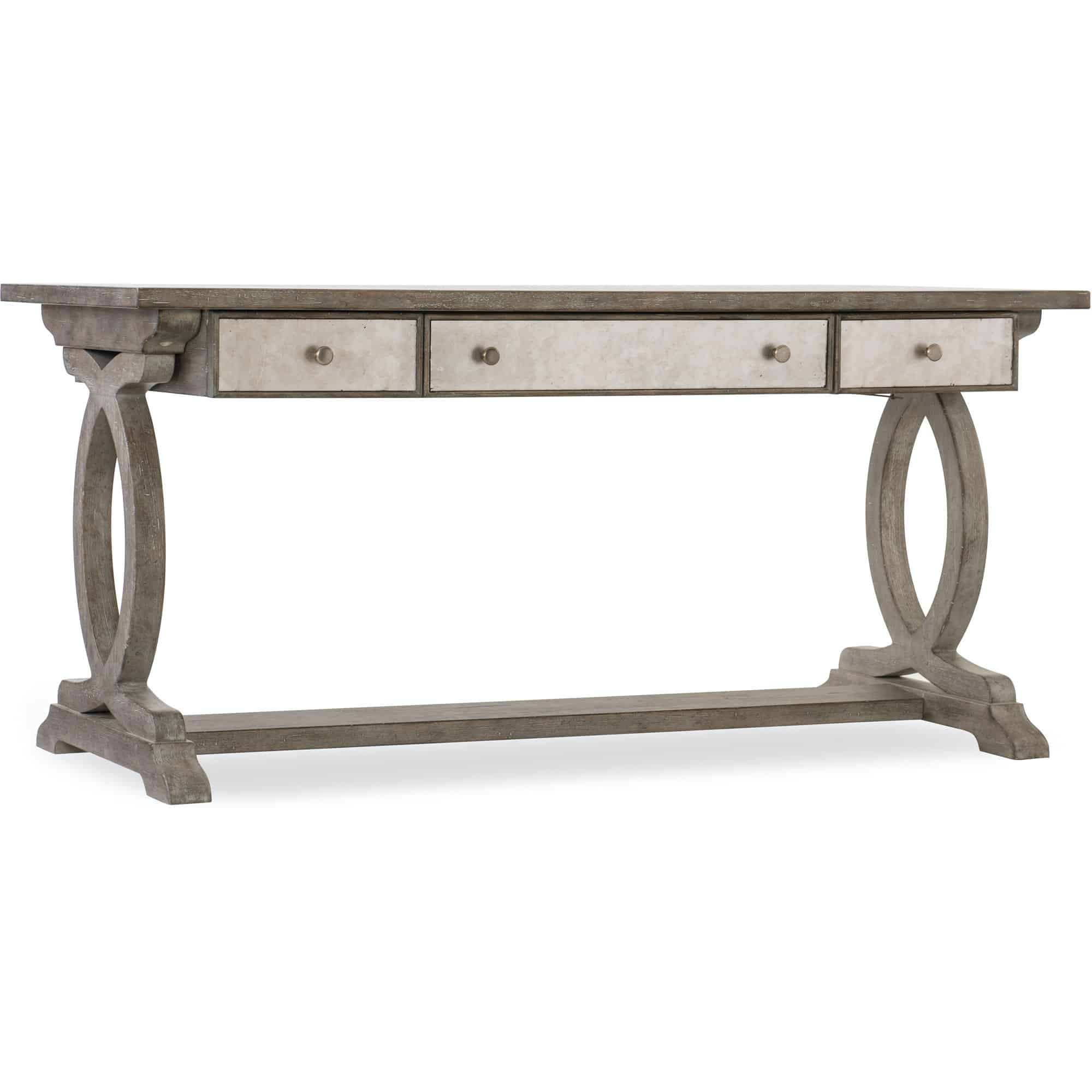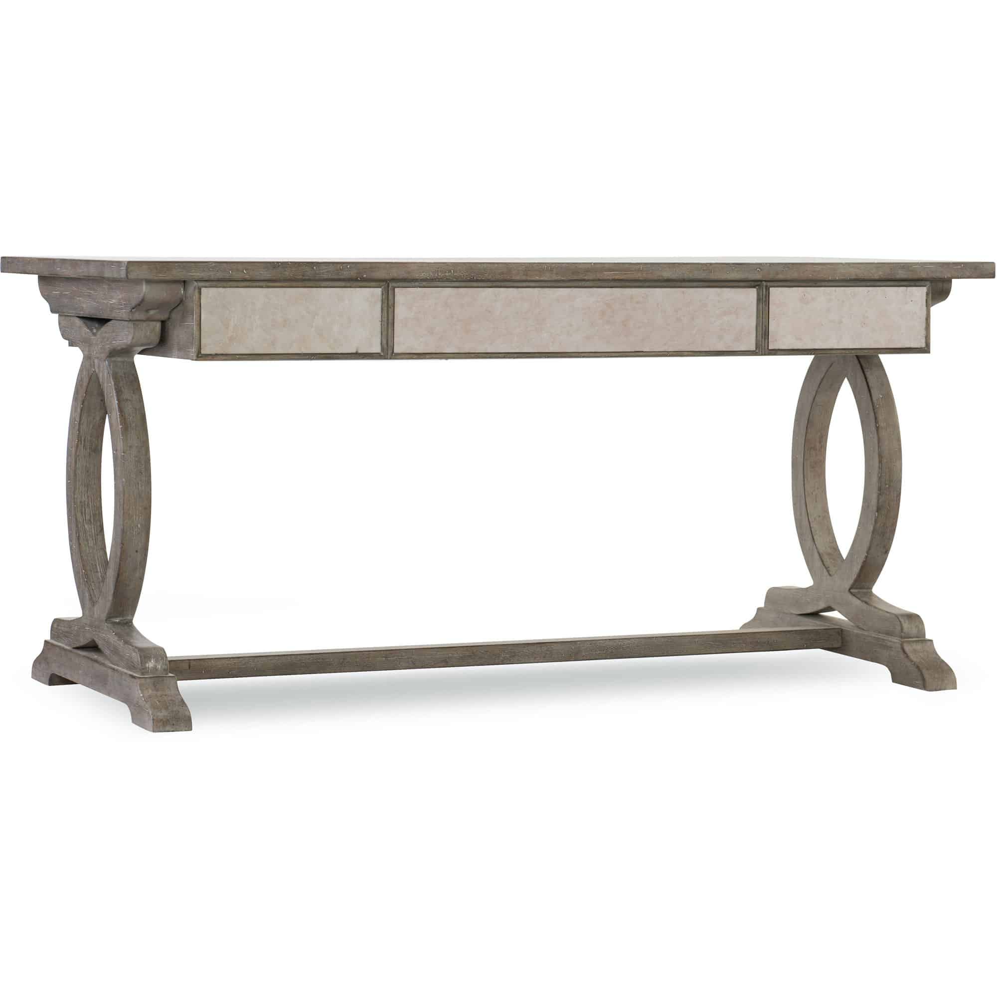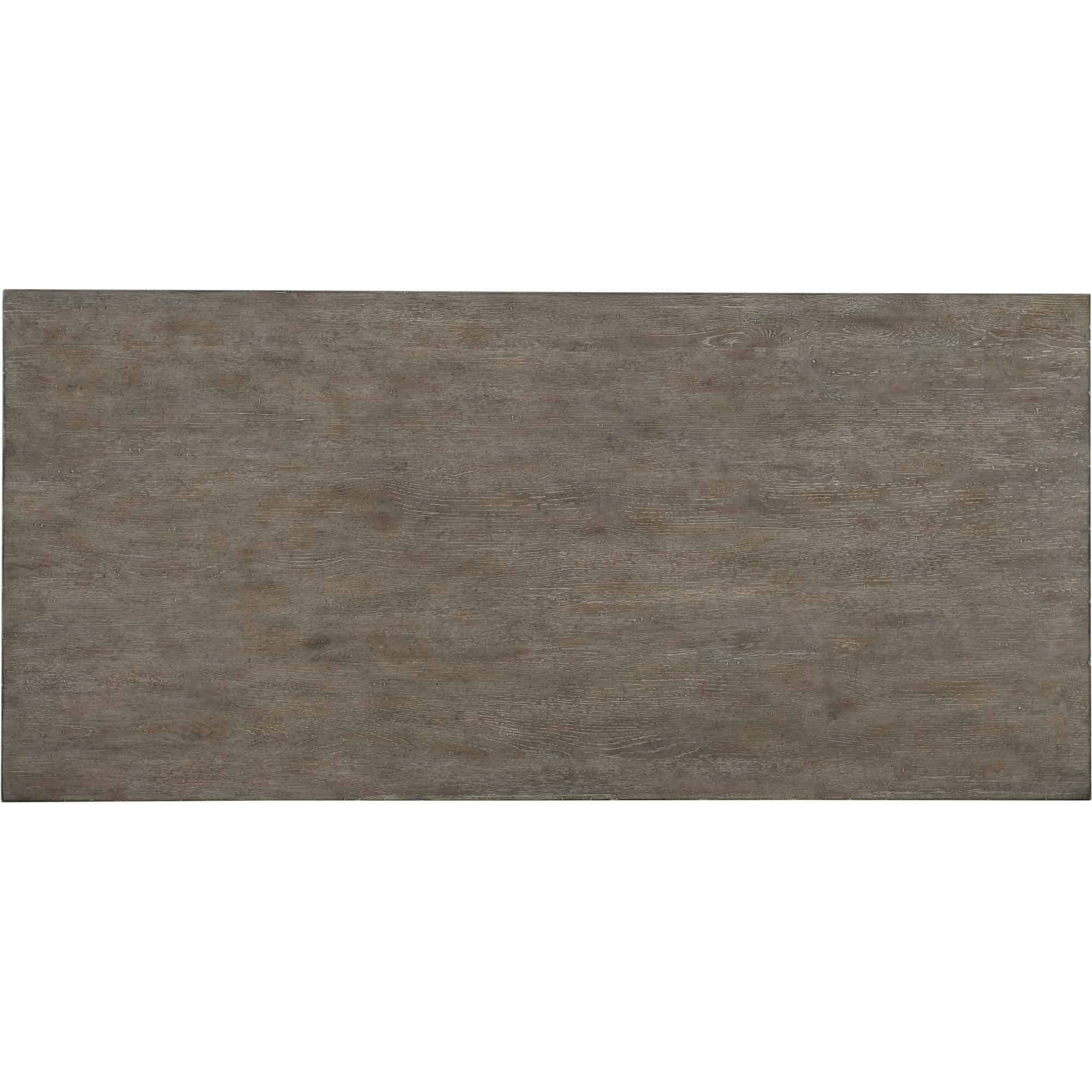 Finish: Eglomise glass accents, medium wood finish with distressing including antiquing, wire brush, gouging and rasping
