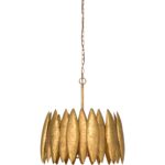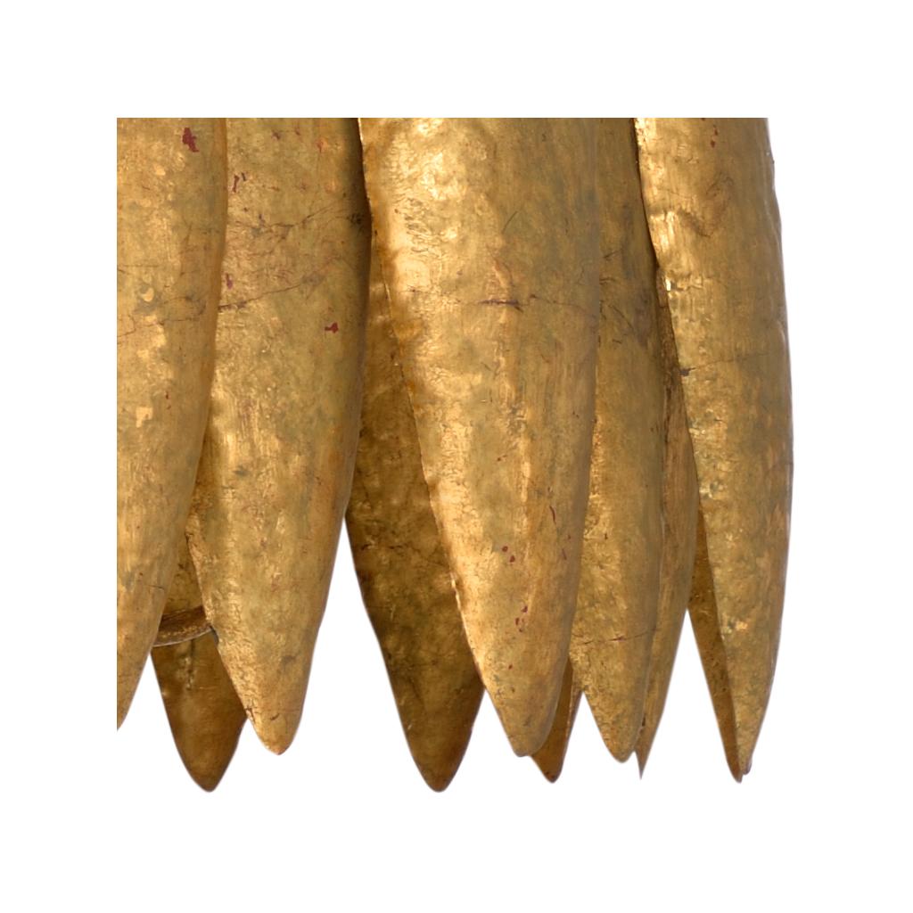 Antique gold leaf finish on iron chandelier. Comes with 6 feet of chain.