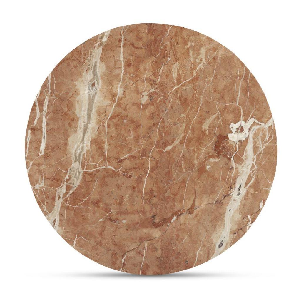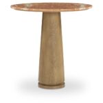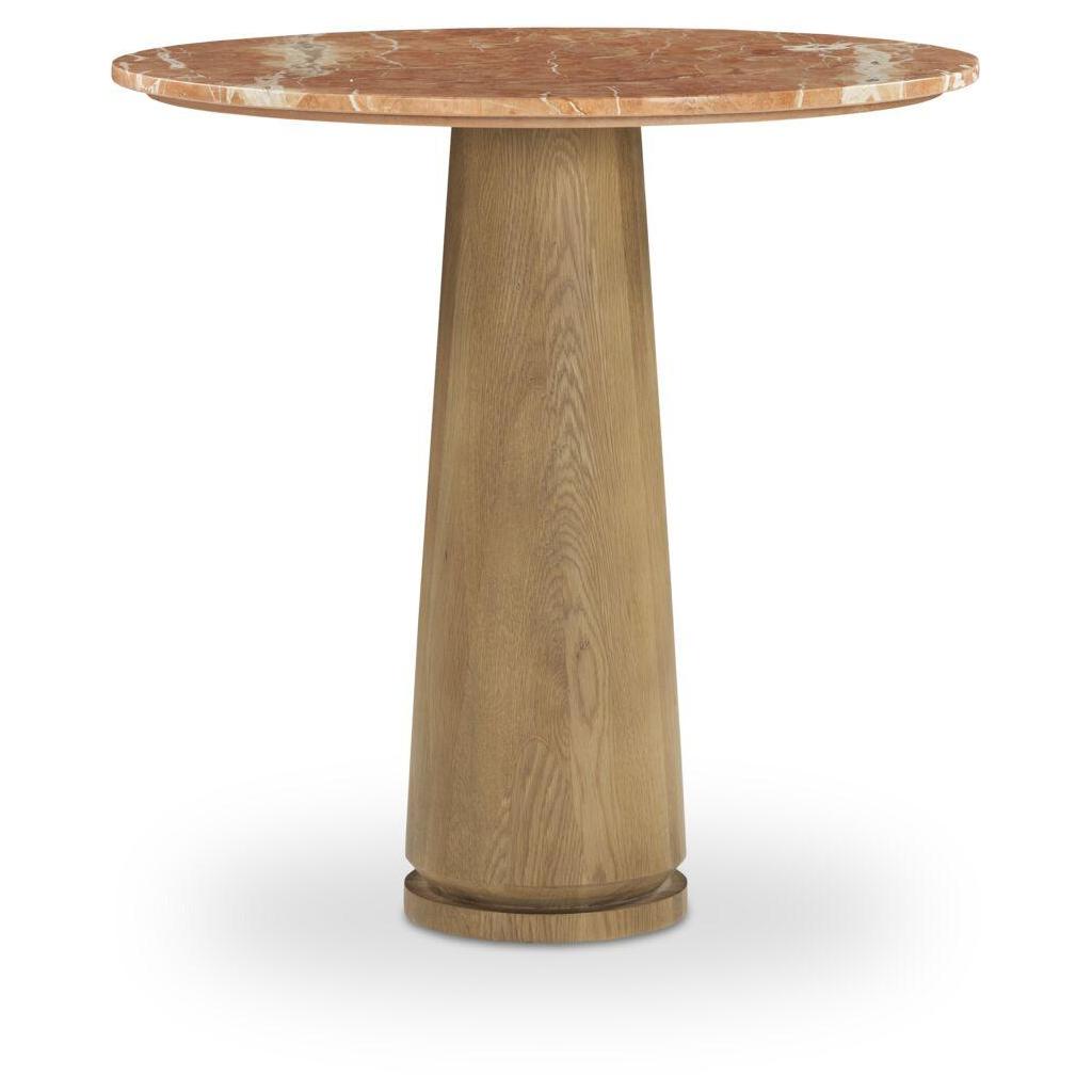 - Expressive Marble: The Sage Cafe Table combines a round Rosso Alicante marble top with a mid-tone brown oak pedestal base, creating a complementary blend of natural materials.