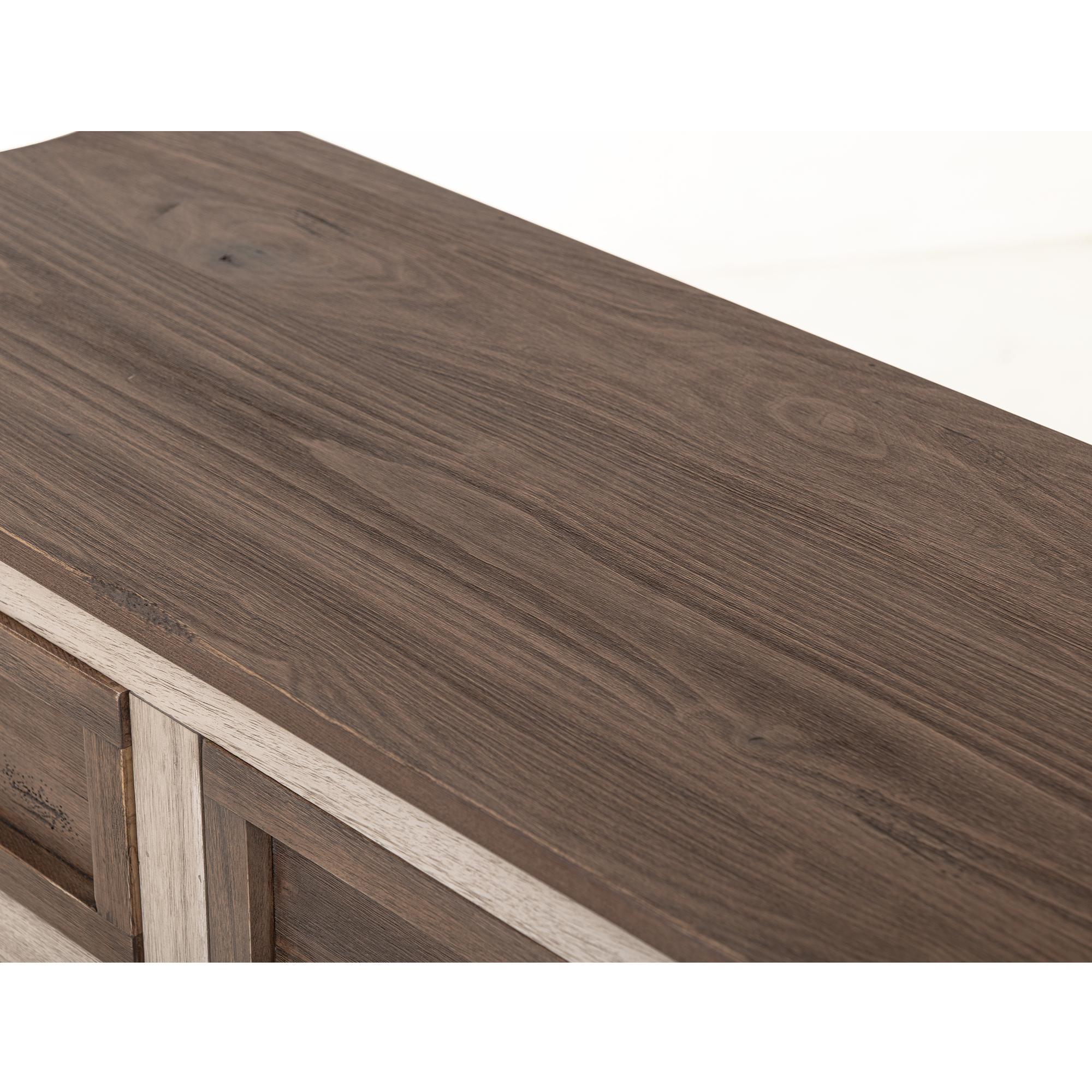 - Multi-step lacquer finish in a cream tone on the case and caramel brown on the tops. Additionally, the wood is wire-brushed and features a wormhole effect.