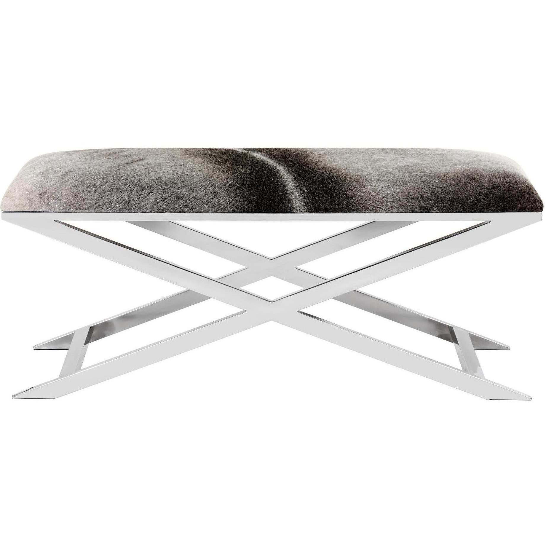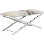 Made in India, the Sahara bench is beautifully unique as no two are the same. Features a stunning genuine cowhide seat in varying grey tones with a polished stainless steel x-base. Great for contract and residential placements. As cowhide is a natural material, organic markings on the animal may still be visible and there may be apparent differences in hair length, colour, and pattern. No two pieces are alike and images on site may not capture these qualities precisely. Made in India. With refined craftsmanship, this design was brought to life by skilled local artisans. By nature, these materials develop unique imperfections such as fissures, markings and colour variations for a truly one-of-a-kind piece.