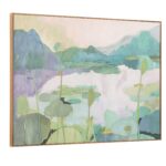 The Saison framed painting captures a serene landscape, offering quiet reflection in the living space. Soft pastel hues depict dreamy lilypads and water lilies, transitioning into an abstract backdrop. Masterfully crafted with acrylic on canvas and framed in solid pine, this artwork seamlessly blends contemporary style with timeless motifs
