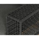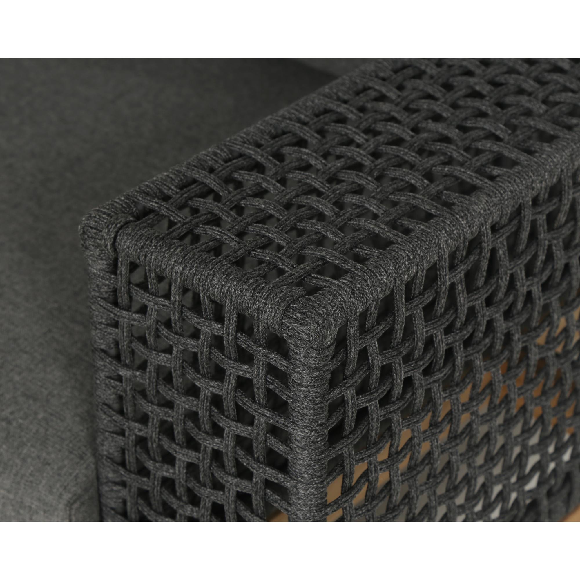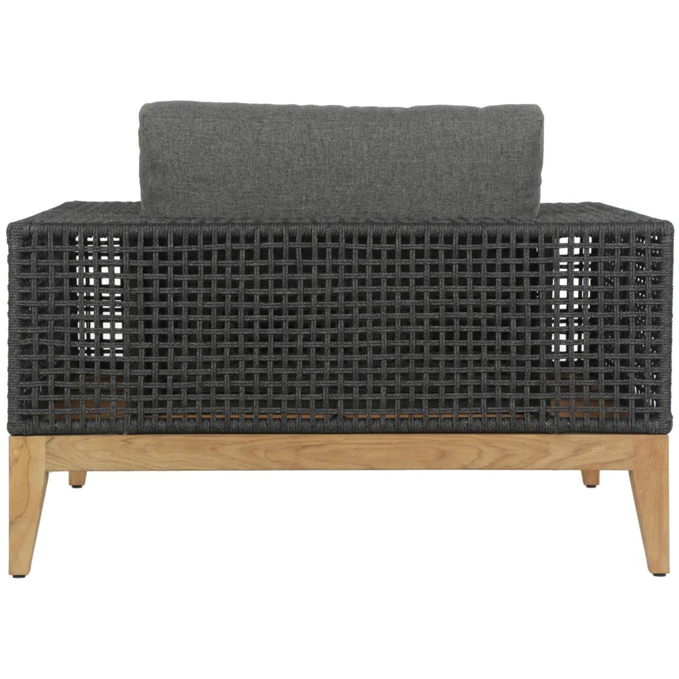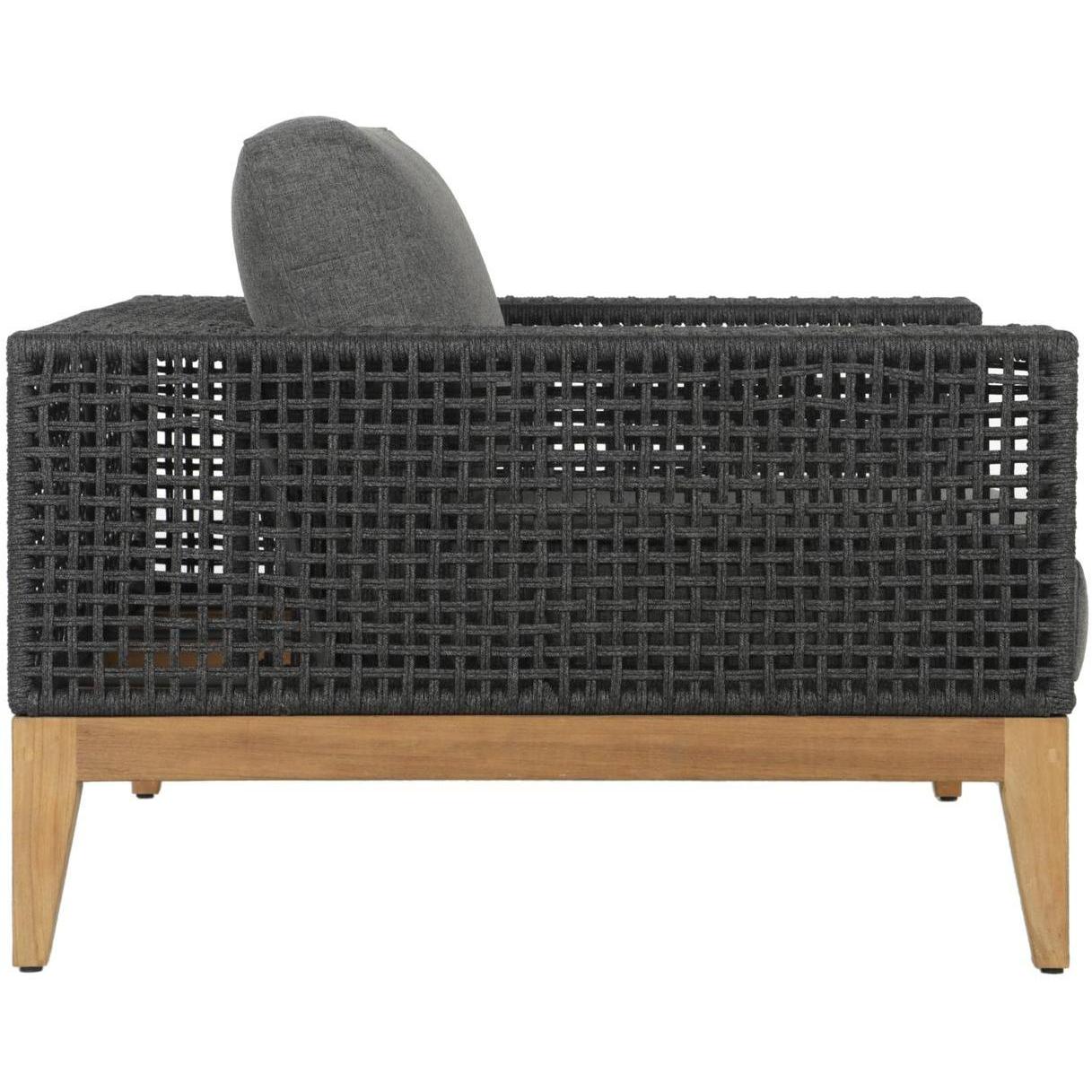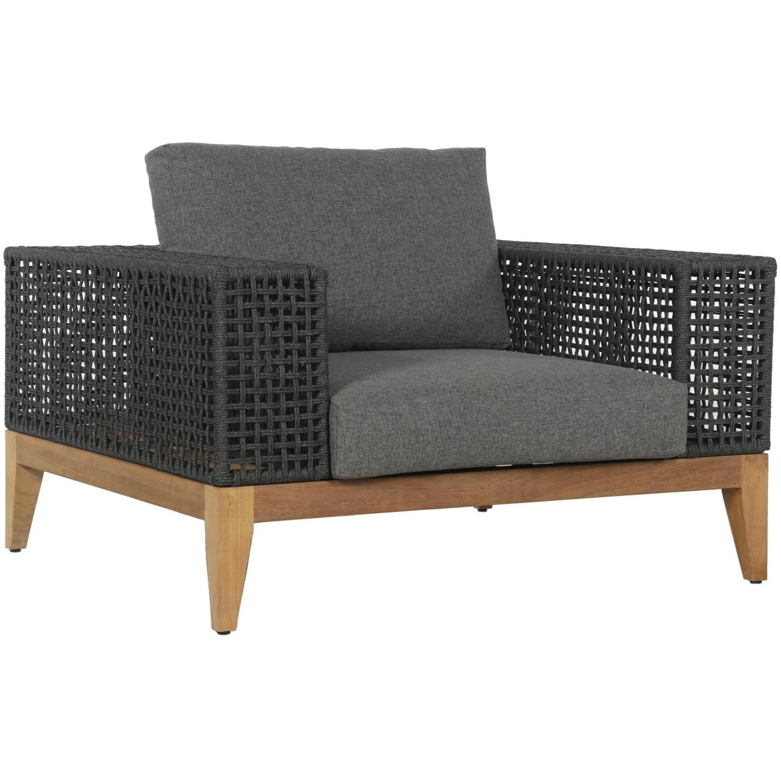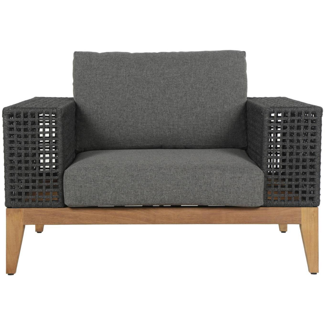 Bring an effortless sophistication to outdoor living and lounge spaces with this bold armchair from the Outdoor by SUNPAN collection. Features a deep seat in gracebay grey fabric with wide powder-coated aluminum armrests wrapped in dark greymix weave. A solid natural teak wood frame completes the design. Suitable for indoor and covered outdoor spaces.