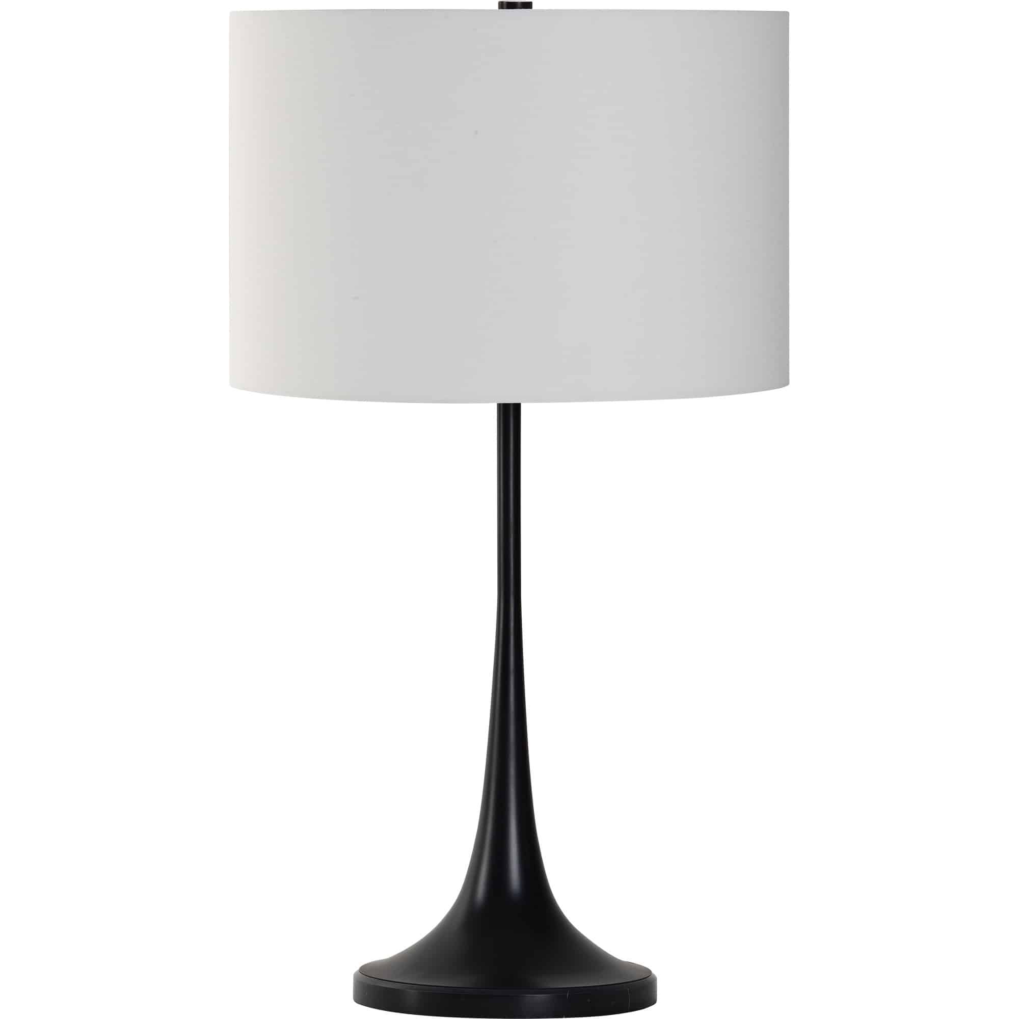 A strong and sleek design. The table lamp is anchored with a black marble tulip shaped base. The off-white cotton shade adds lightness to overall appeal.