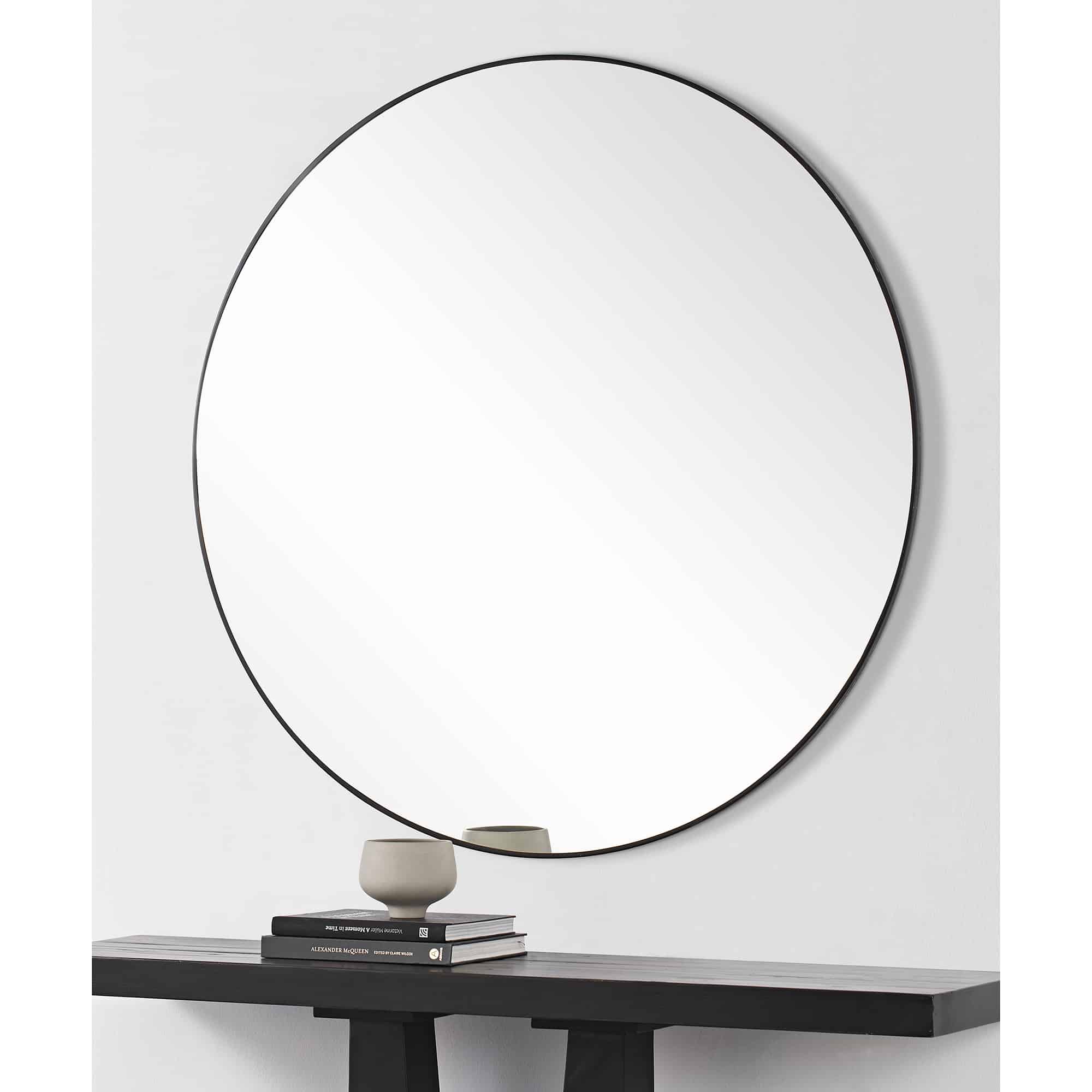 Minimal in style yet monumental in scale, this mirror fills the contemporary interior with glowing reflection. With a 48-inch circumference, it requires dedicated wall space to make its design impact. Showcasing an iron frame painted in matte black, it adds a bold touch to the space and allows for ease in interior arrangement.