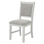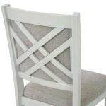 - Solid rubberwood chairs in a whitewash finish with textured, warm grey fabric upholstery