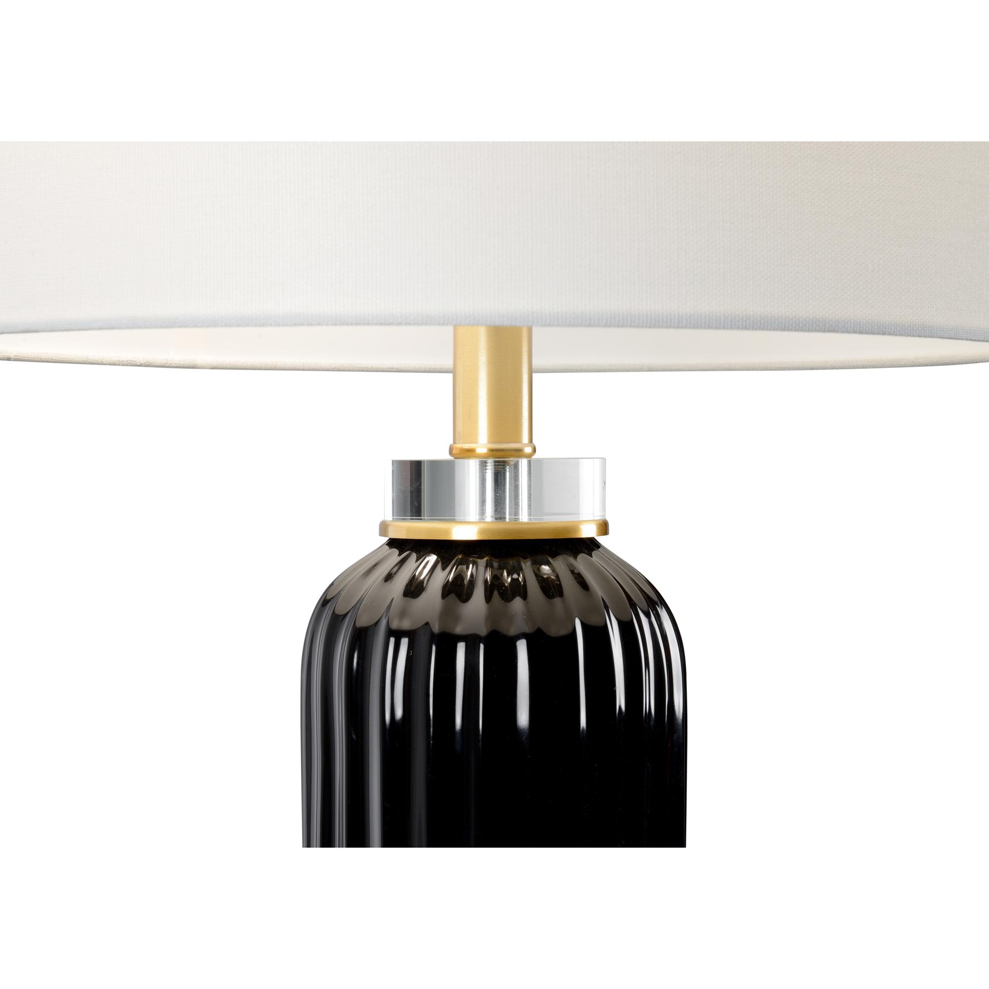Whether at home or in the office, samuel ceramic lamp is a contemporary look that can transform your room. This 30″ table lamp is crafted of black glazed fluted ceramic. The smooth curves of the ceramic contrast with the straight lines of the clear crystal base while the warm brass accents pull the design together. It is topped with a classic off white linen drum shade to diffuse light throughout your space.