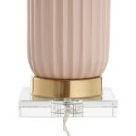 Whether at home or in the office, Samuel ceramic lamp is a contemporary look that can transform your room. This 30″ table lamp is crafted of glazed fluted ceramic. The smooth curves of the ceramic contrast with the straight lines of the clear crystal base while the warm brass accents pull the design together. It is topped with a classic off white linen drum shade to diffuse light throughout your space. Available in multiple colors.