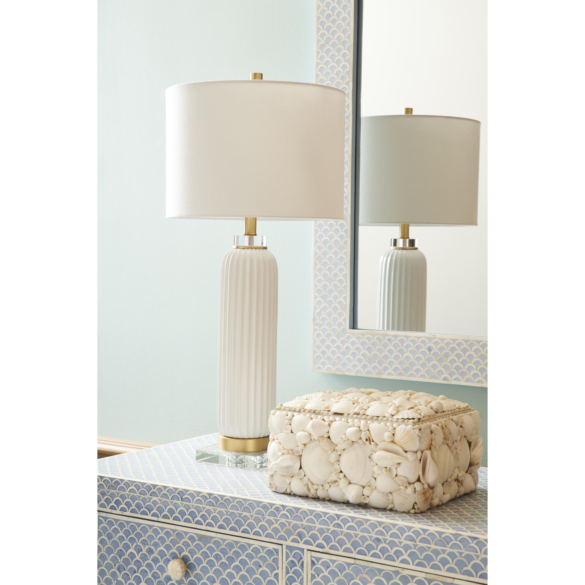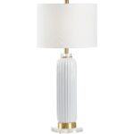 Whether at home or in the office, samuel ceramic lamp is a comtemporary look that can transform your room. This 30″ table lamp is crafted of white glazed fluted ceramic. The smooth curves of the ceramic contrast with the straight lines of the clear crystal base while the warm brass accents pull the design together. It is topped with a classic off white linen drum shade to diffuse light throughout your space.