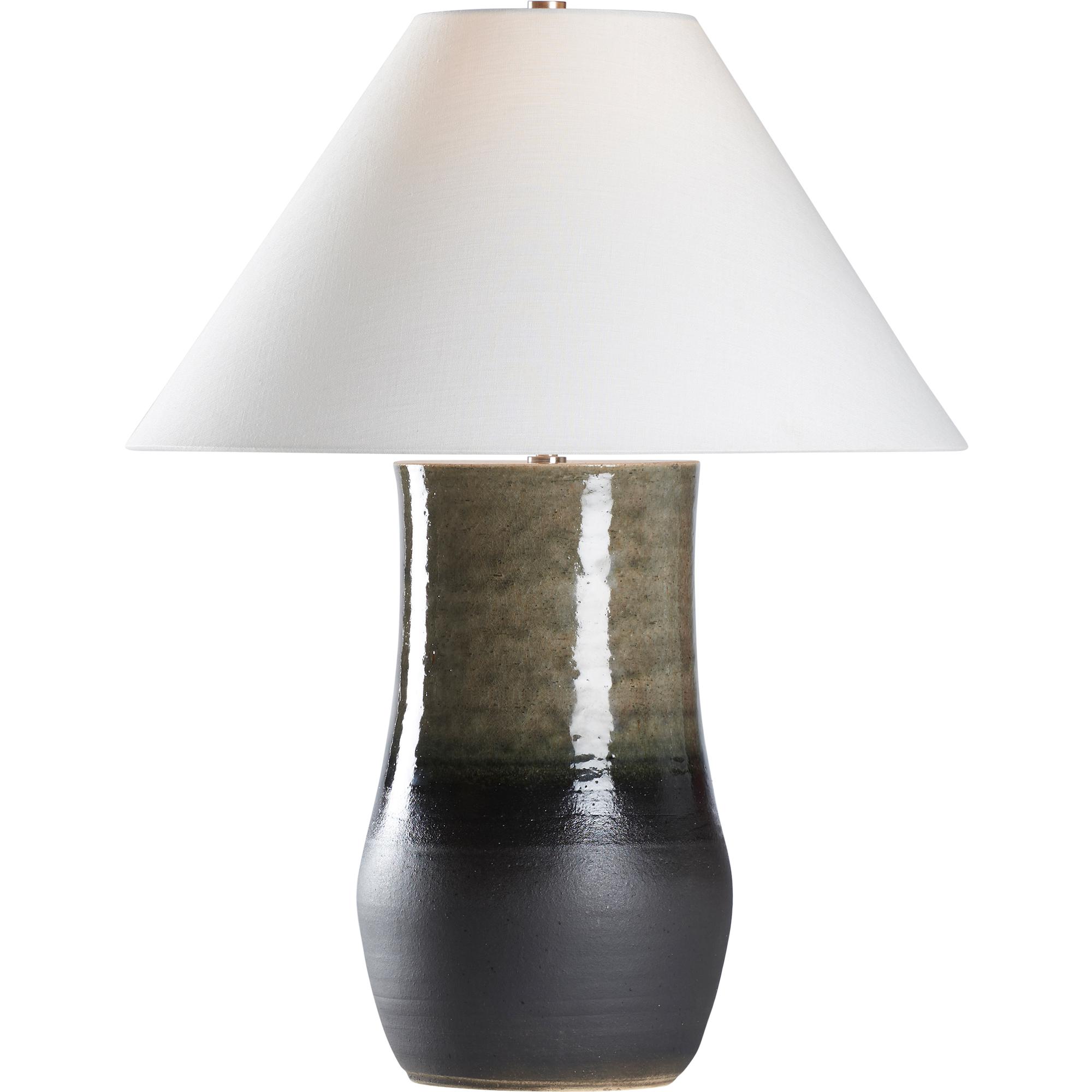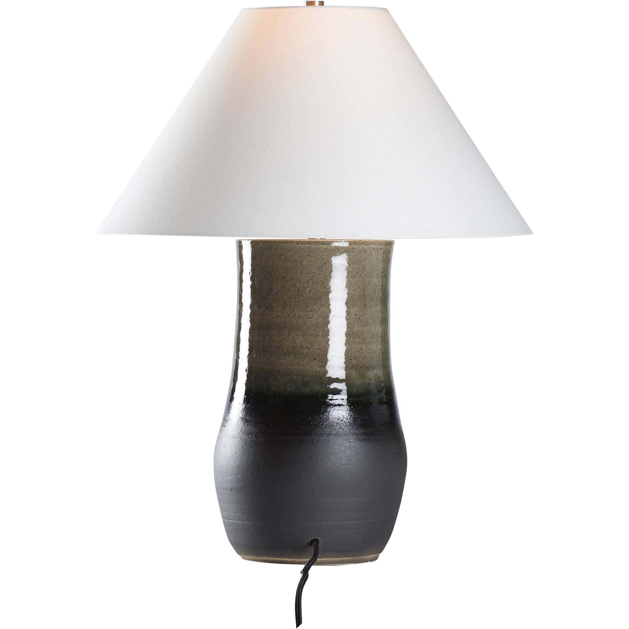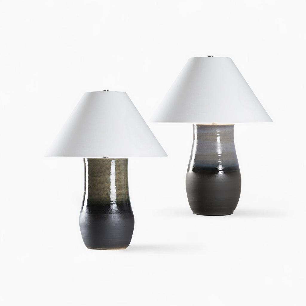 The Sana Table Lamp, part of the Shiga collection, is hand turned and finished in one of six ancient kilns in Japan. This classic modern jar lamp features a blue ombre glaze and is completed with cloth wiring and topped with a refined rolled-edge linen shade. Made in Japan.