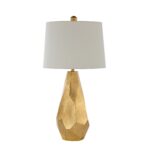 Bounce light and style throughout any room with the stunning Sanae table lamp. Designed with a multi-faceted gold-leaf body, this light holds a gemstone-like presence for all to admire. Sitting in calming contrast to all the glam, is an ivory linen tapered drum shade that filters adjustable ambient light throughout the space setting a warm and welcoming tone.