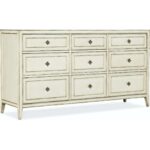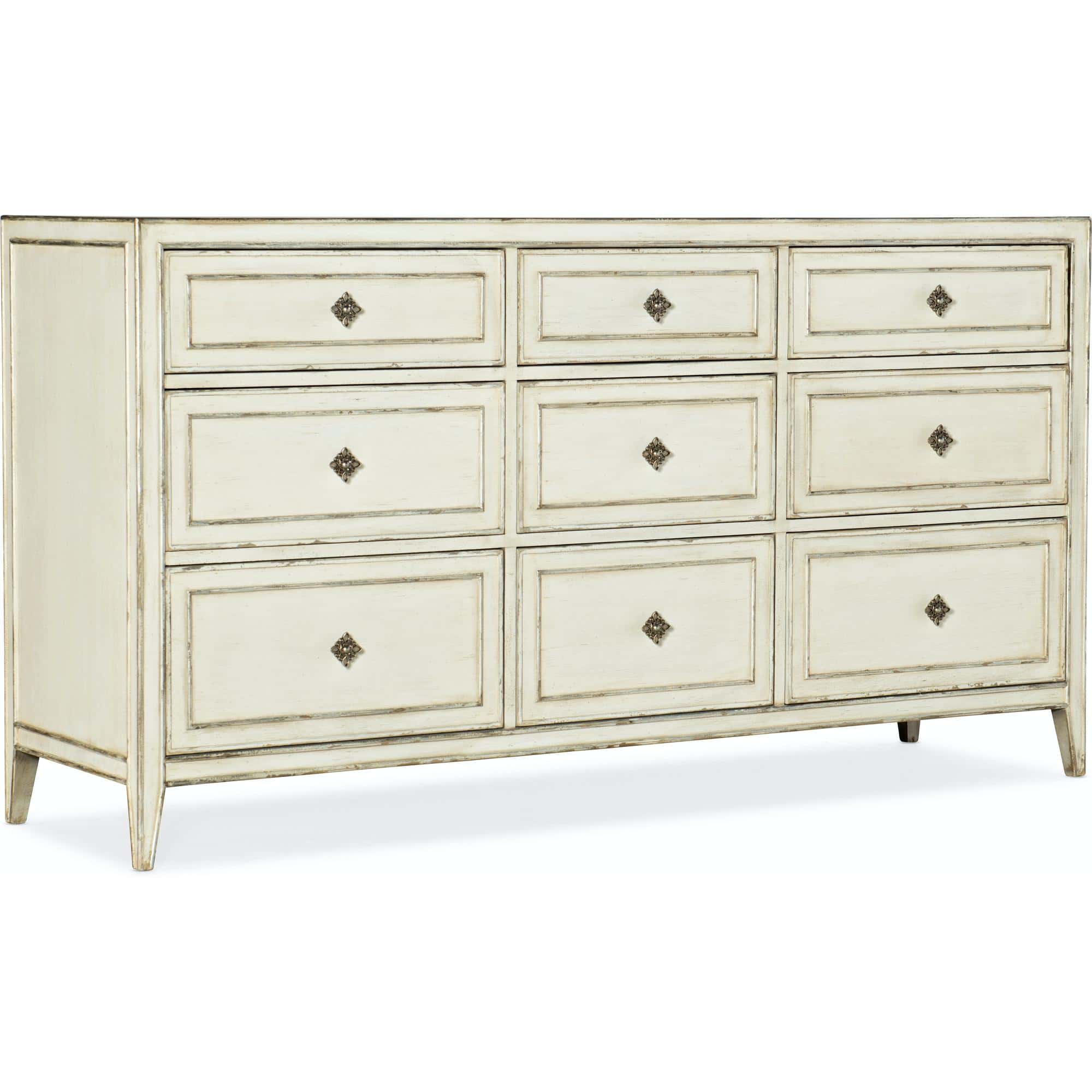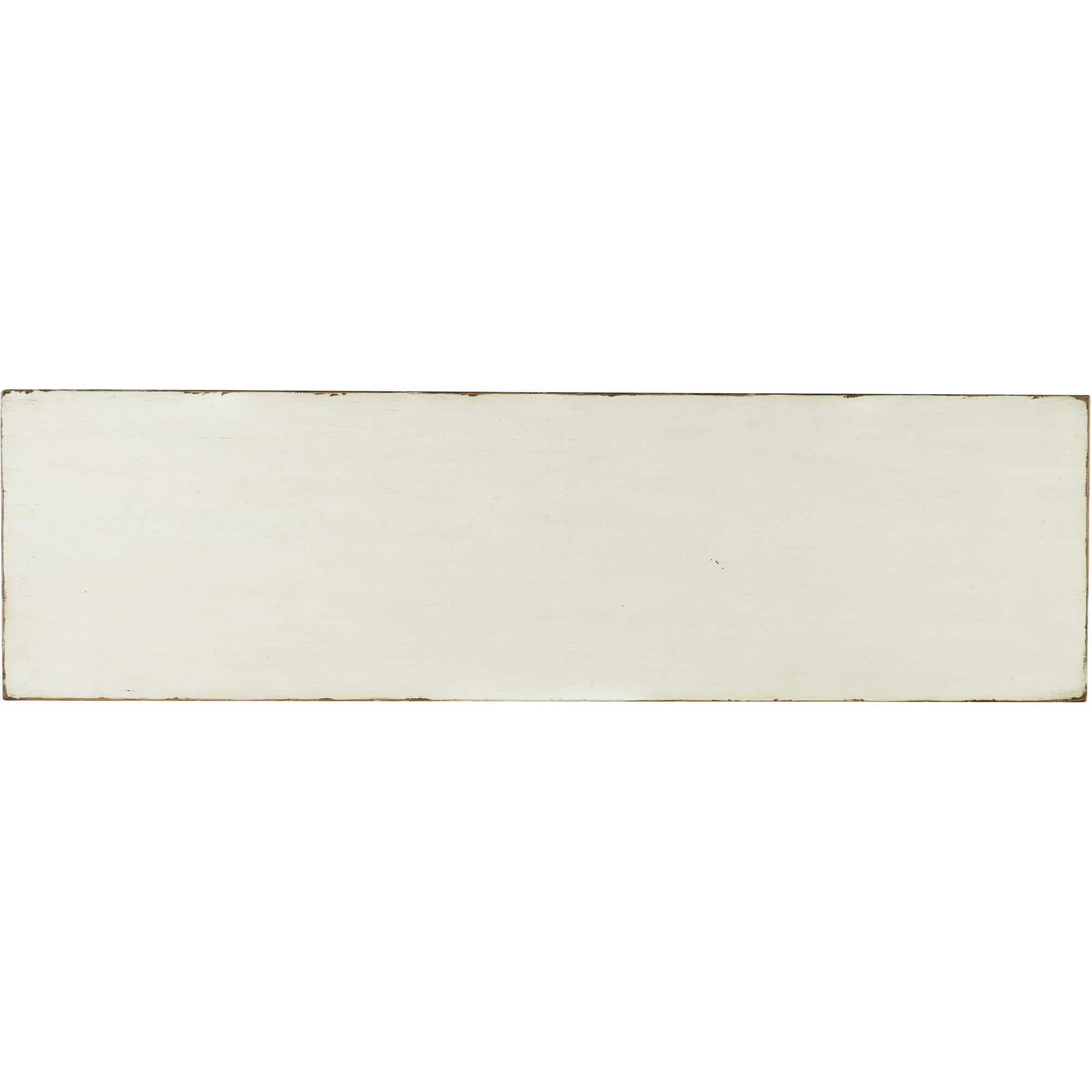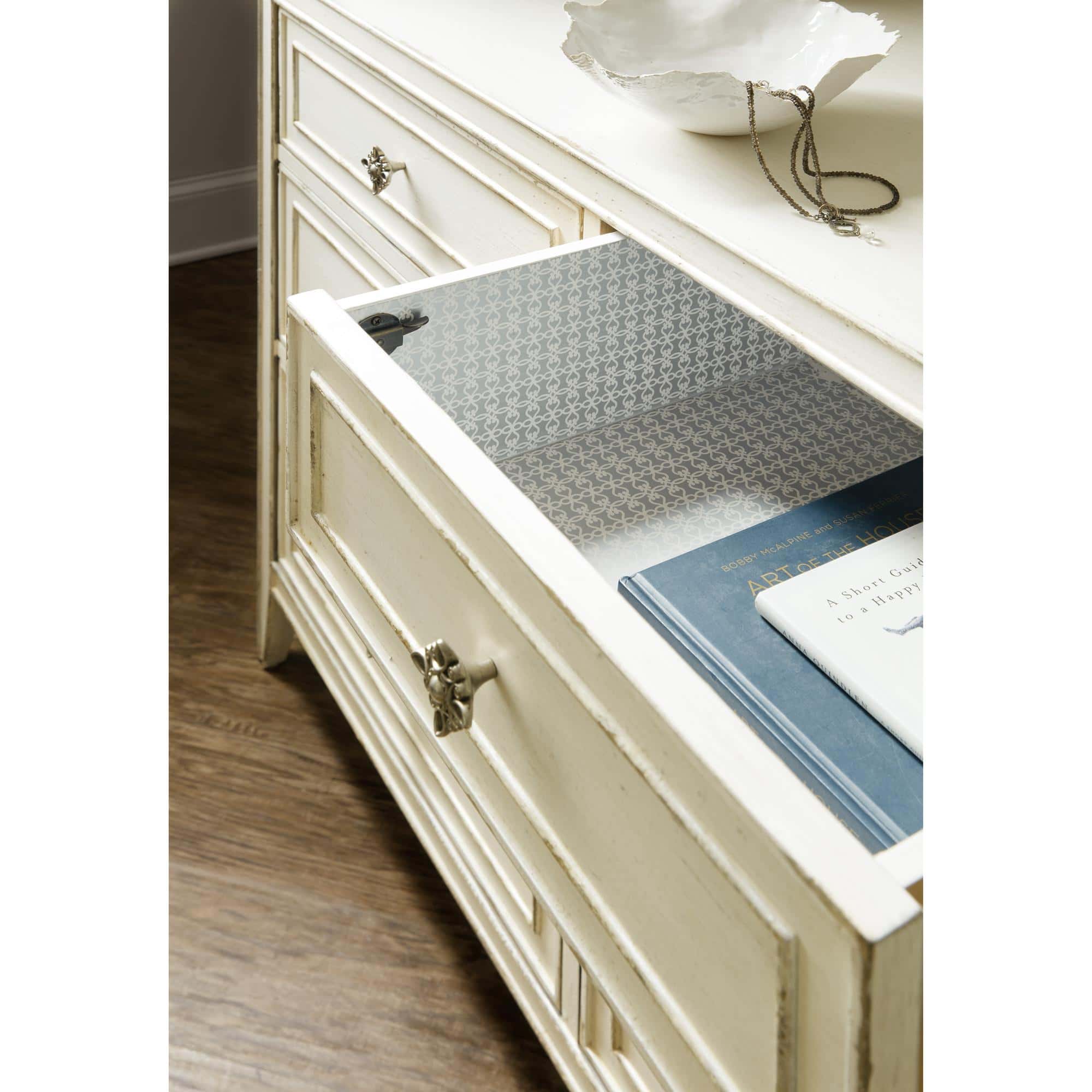 Finish: Blanc, a creamy white finish accented with champagne and silver tipping. Distressing includes rasping. Antique silver colored metal alloy custom decorative pull designed to look like a piece of jewelry.
